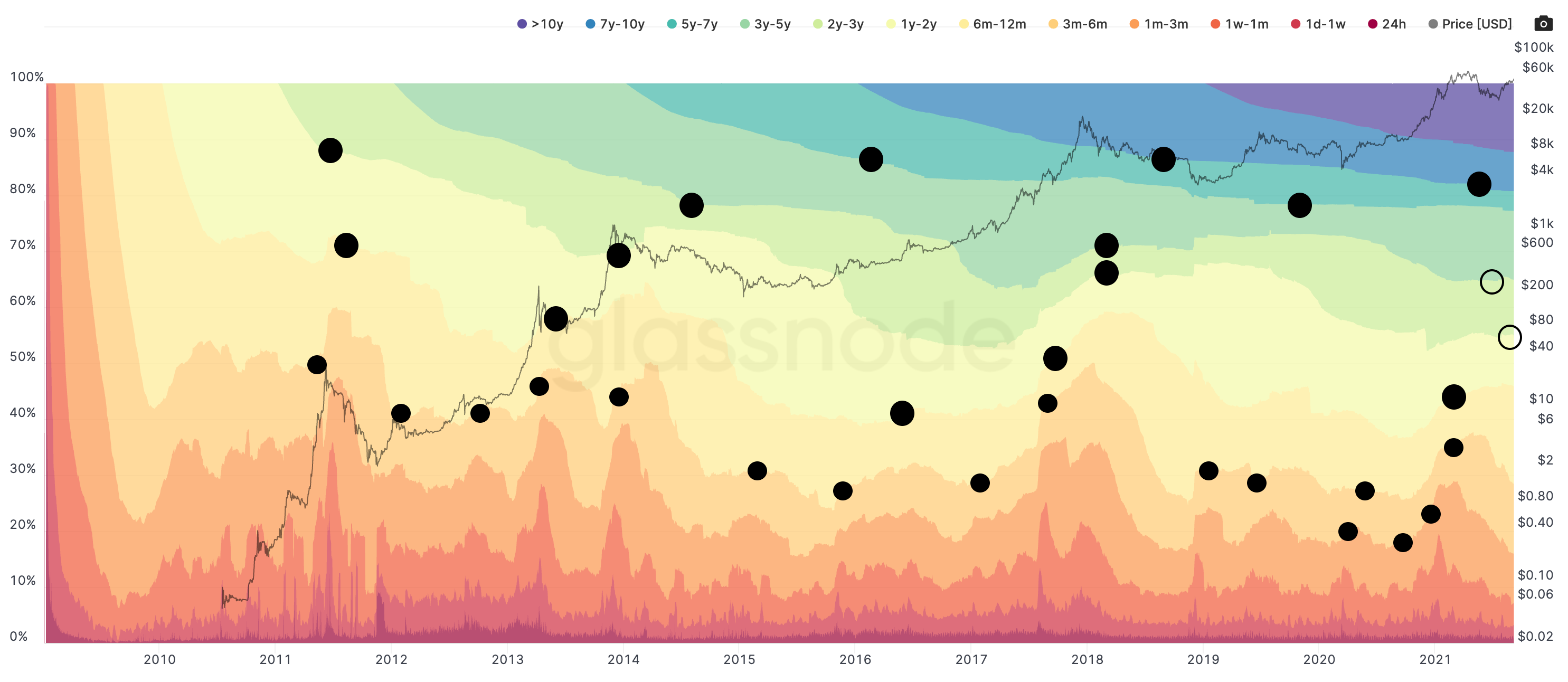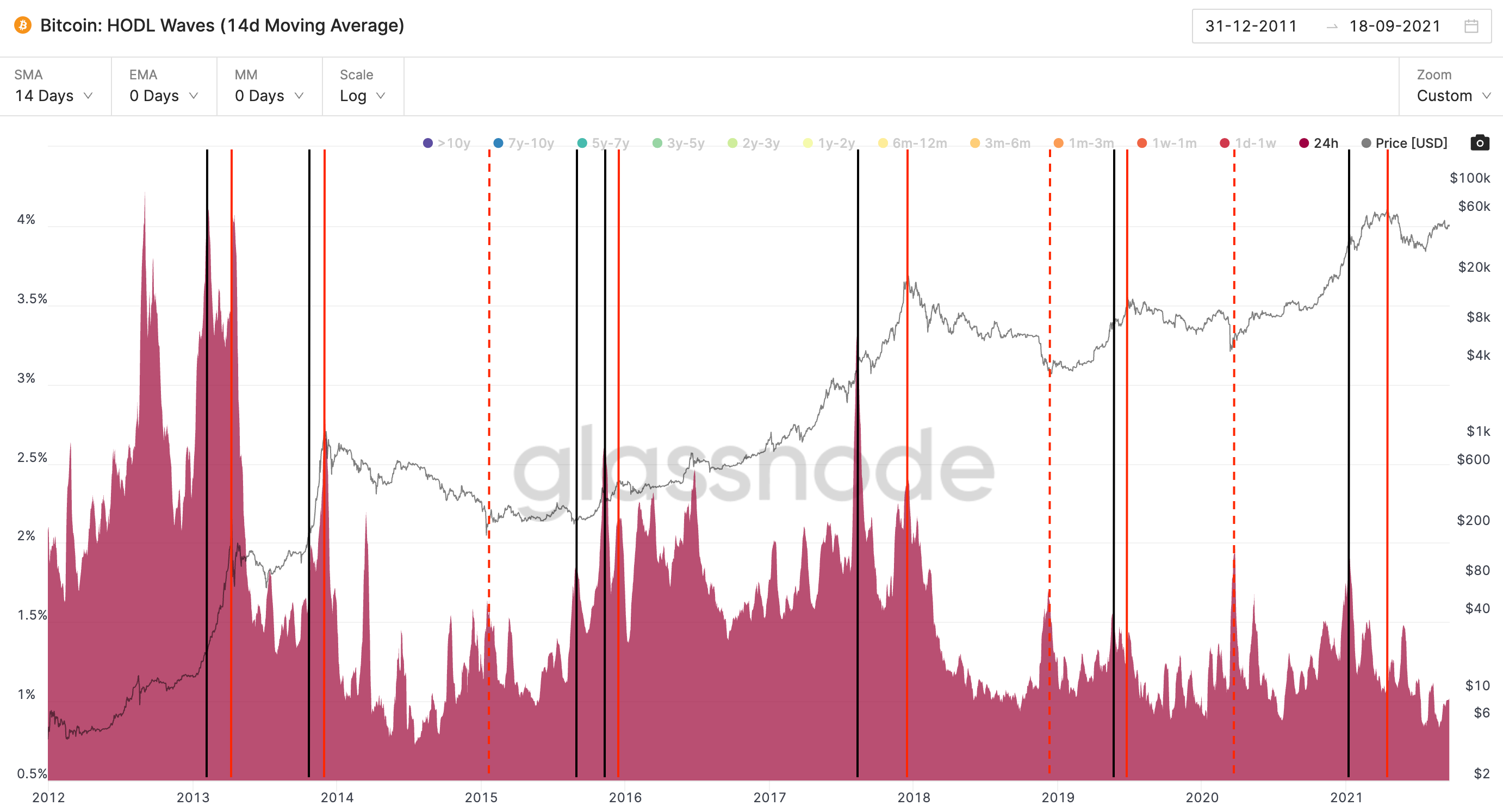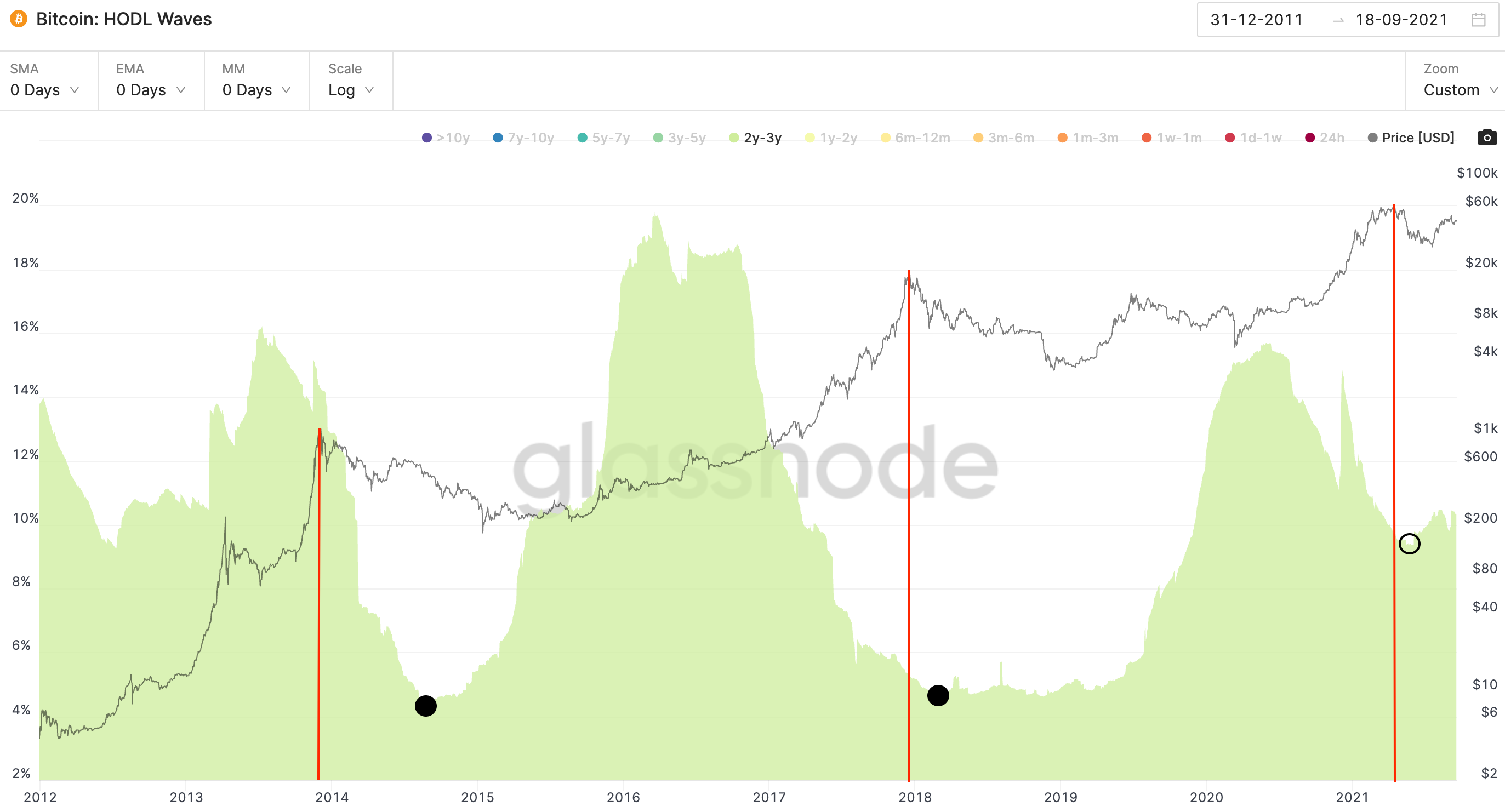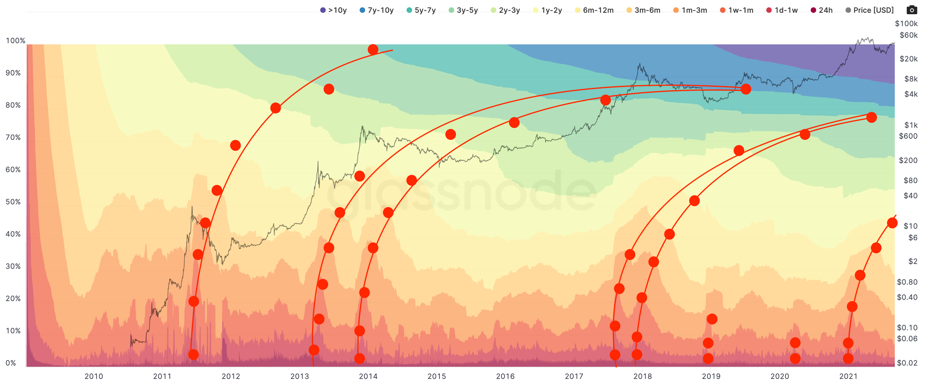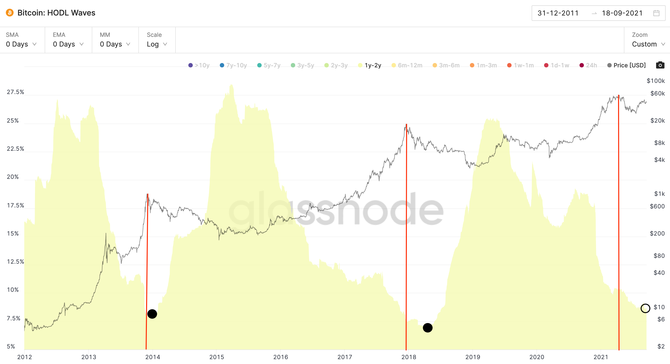 Pulling away the other groups this is what we are left with. Here’s the 1y - 2yr group. It pairs up with market tops fairly well. And note how the recent $65k top lines up in a similar way as the prior two market tops.