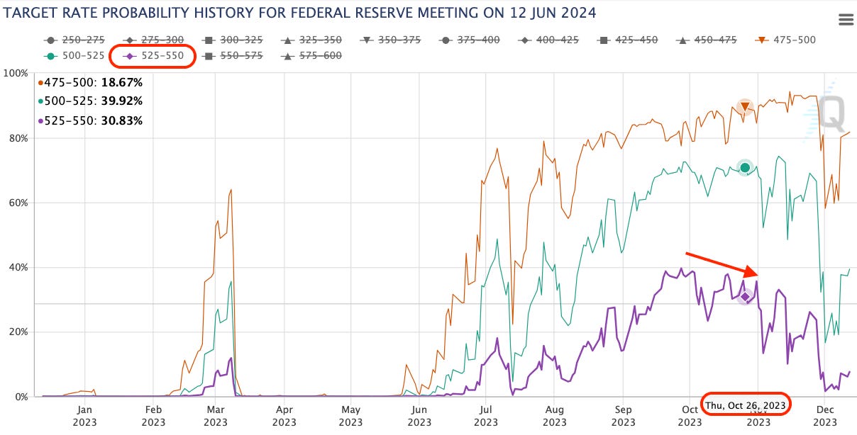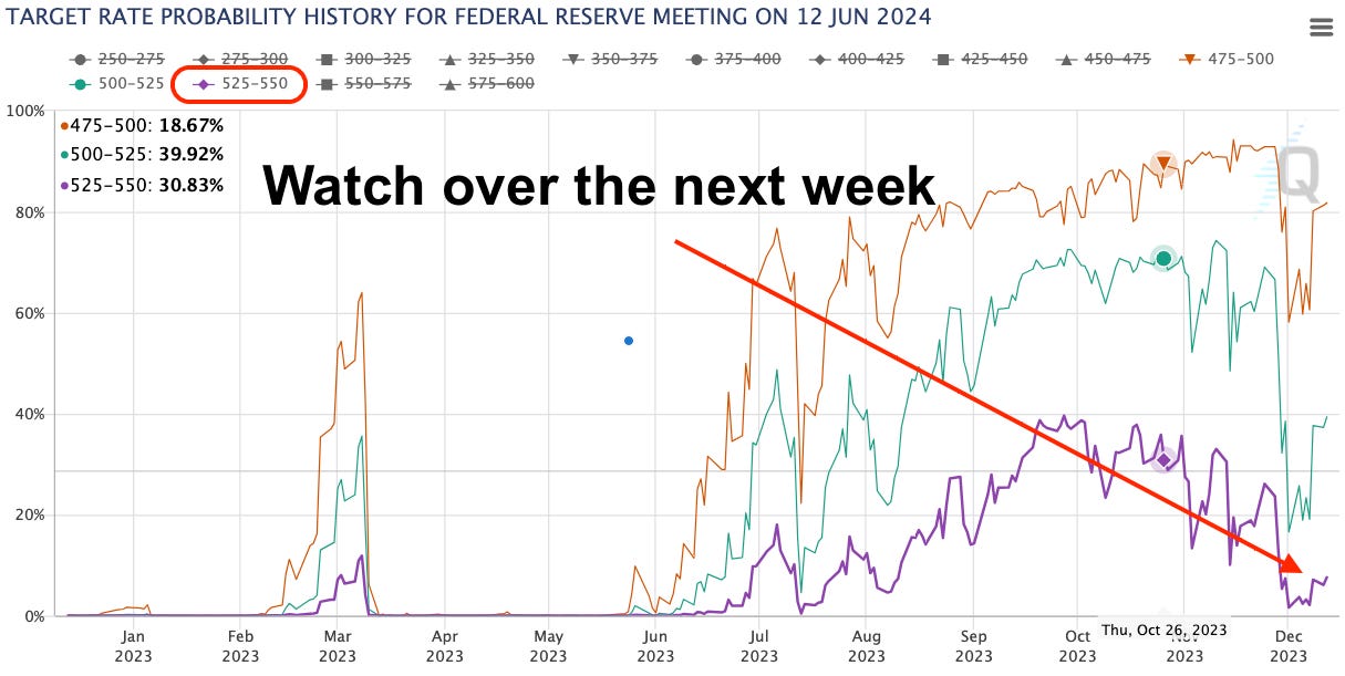 The market is beginning to expect rate cuts. In the chart below, we have expectations over time for rates coming out of the June 2024 meeting. We can see in the run-up to October 26 – when the market began its most recent rip higher – rate cuts were starting to get priced in.