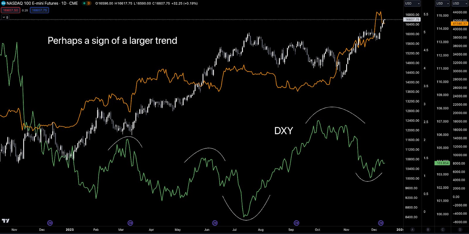 But what we know is that some of this entity’s activity is correlated with the U.S. Dollar Index (DXY) or its reversal. And if we pull up DXY and add it to the chart above, we can see what might be happening here…