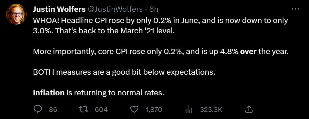 Based on readings from the Consumer Price Index (CPI), which keeps track of a basket of goods and services to measure inflation, prices rose 0.2% in June. But more importantly, they climbed just 3% over the past 12 months. That’s the smallest increase since March 2021.