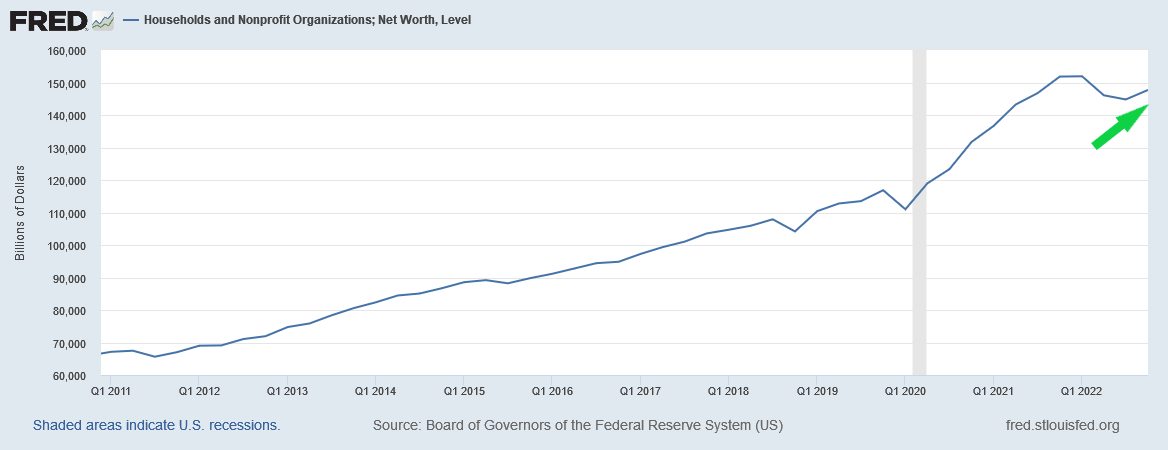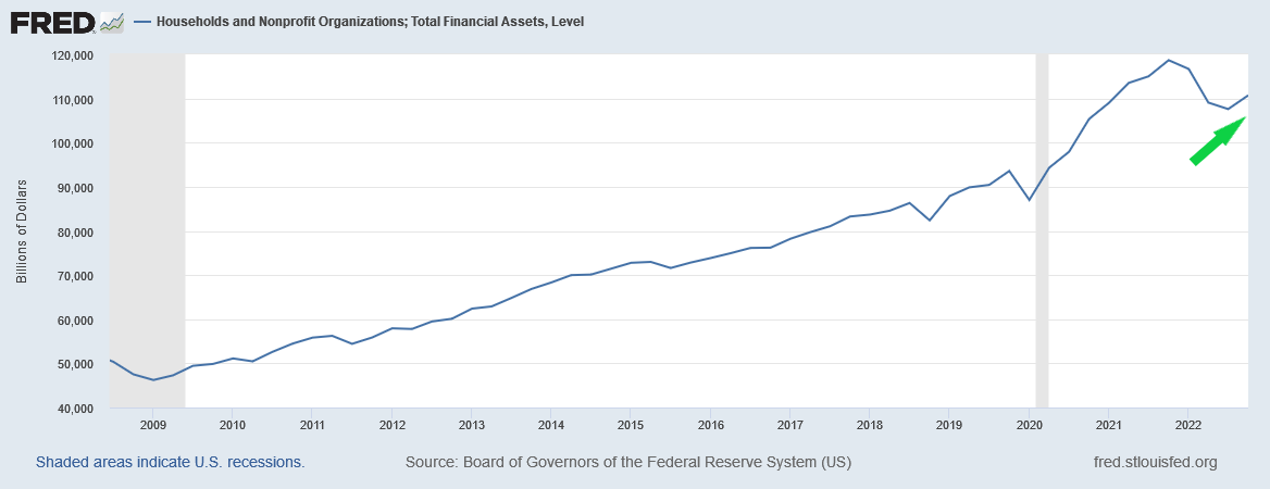 So, it is not surprising that, just like the total financial assets chart, household net worth was actually increasing at the end of 2022.
