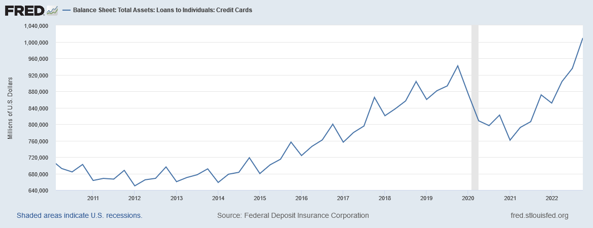 Not to be outdone, U.S. credit card debt also hit an all-time high (contributing to that $16.9 trillion total debt). It reached $930.6 billion at the end of 2022, a YoY jump of more than 18.5%.