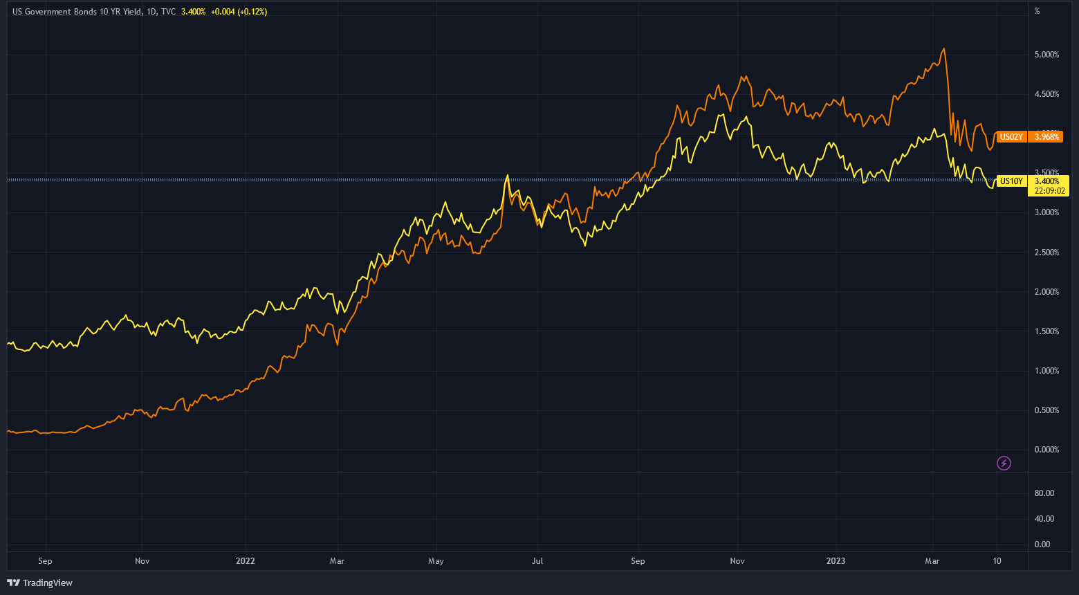 In the chart below, the yellow line is the yield curve for the 10-year Treasury (currently at 3.400%), and the orange line is the yield curve for the 2-year Treasury (currently at 3.968%). This is a spread (difference between two yield curves) of more than 50 basis points, or 0.5 percentage points.