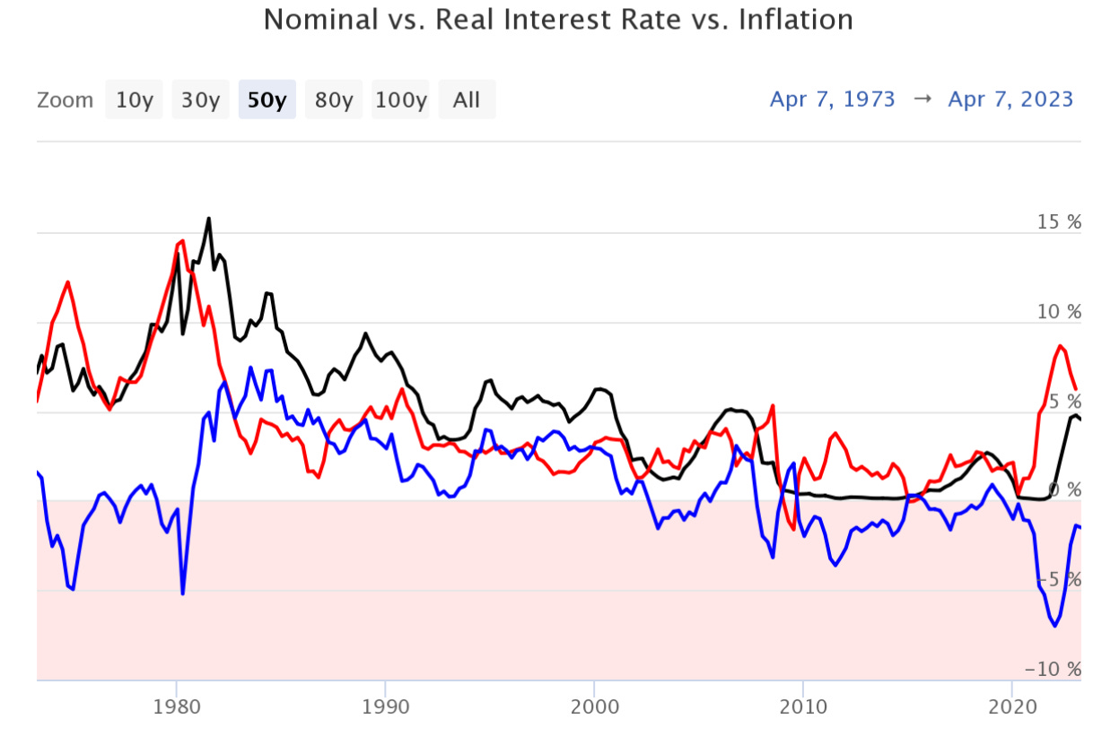 The chart below shows the real rate of interest in blue, inflation in red, and FFR in black.