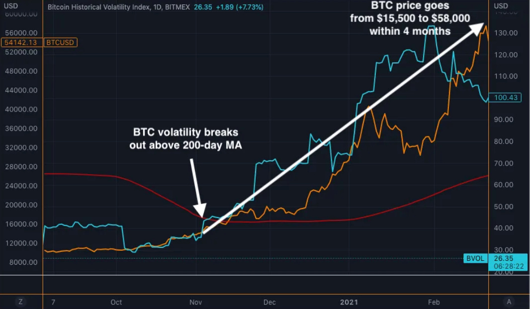 For reference, here’s a chart showing what an expansion of compressed volatility and price (orange line) looks like from late 2020 into early 2021: