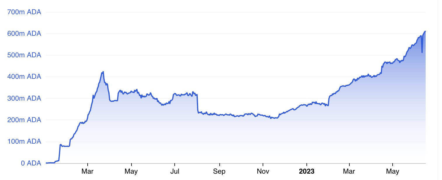 TVL in ADA terms has tripled since the bottom at the turn of the year and is over 50% higher than at the peak in April 2021.