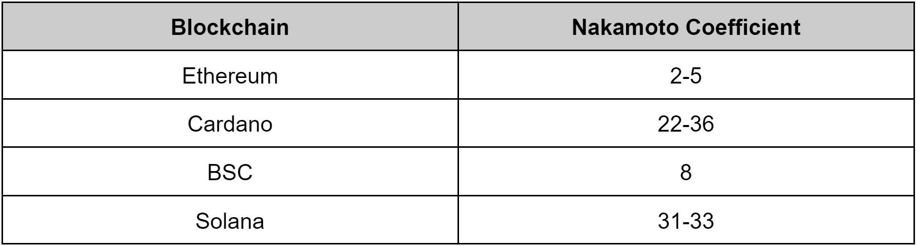 The higher its Nakamoto Coefficient, the more a network is decentralized.3 Below are the coefficients of some of the major chains:4
