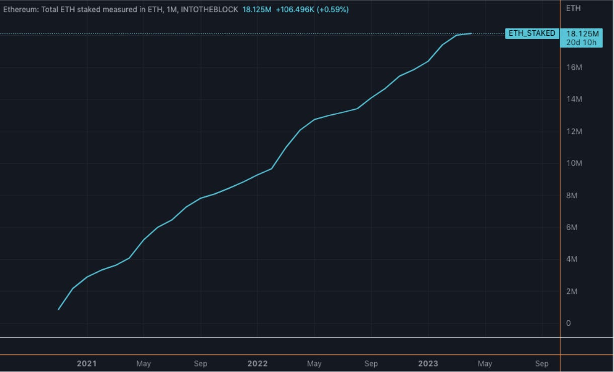 What it shows is the total amount of Ethereum staked to the network since the ETH 2.0 Beacon chain went live in November of 2020, which was the beginning of the network’s shift from proof-of-work to proof-of-stake consensus.