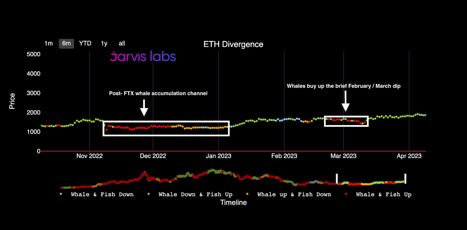 Below, it shows that ETH whales found deep value in March’s dip to the $1,450–$1,550 range. (The red and orange dots indicate whales buying ETH, while the blue and green dots represent whales selling.)