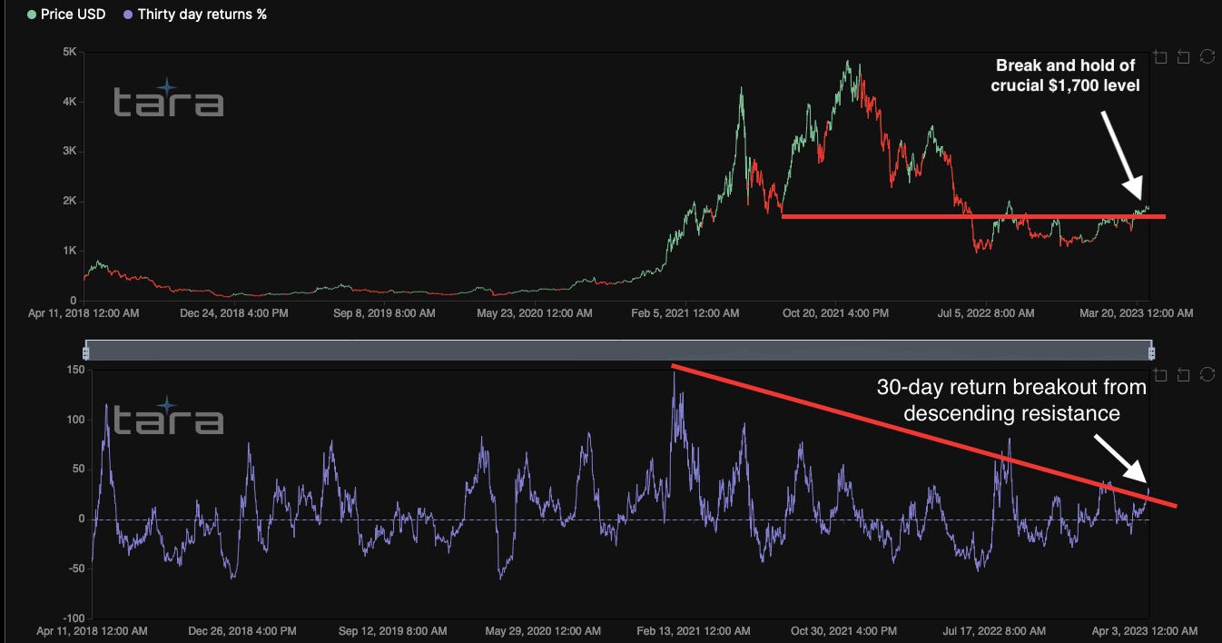 In both those essays, I noted that a high-volume push over $1,700 would be crucial in determining ETH’s trajectory in 2023. Remember, trends tend to follow strong price movements fueled by high volume.