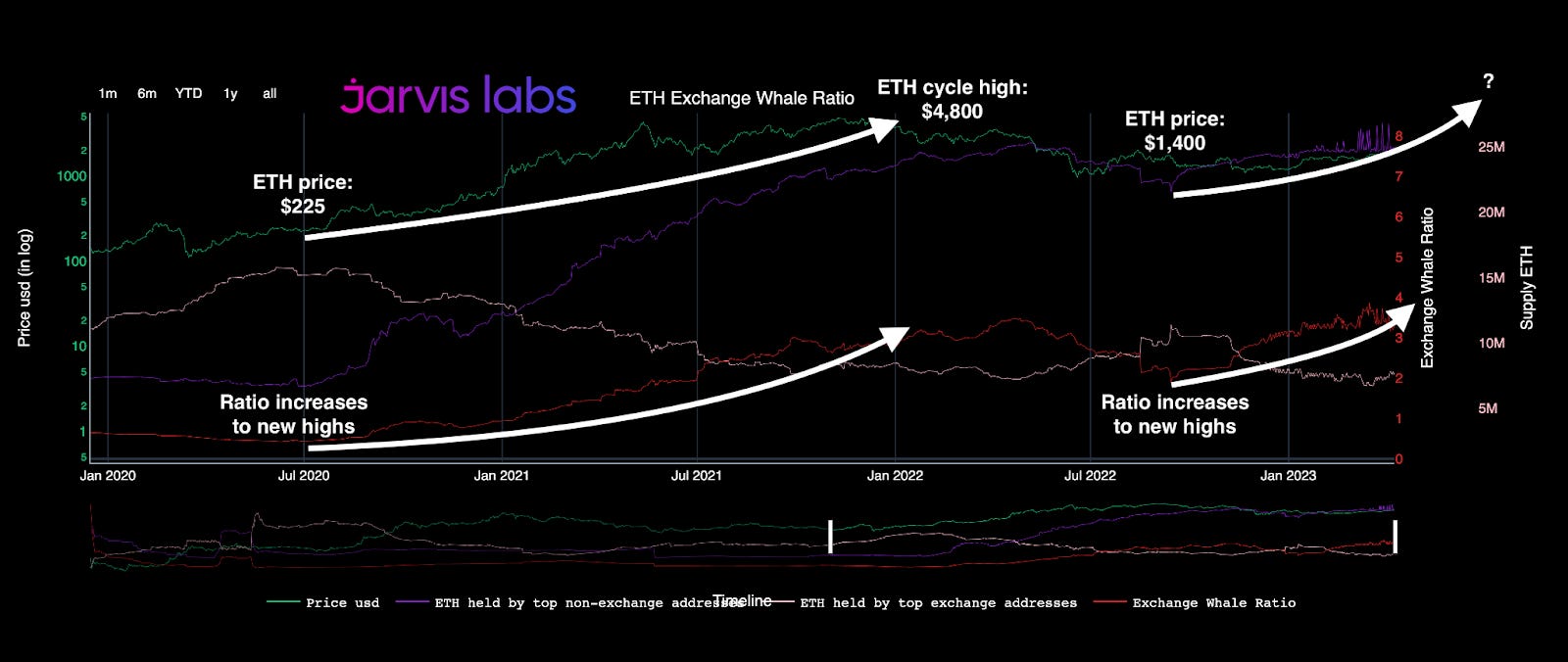 In case you’re not familiar, this is one of our proprietary metrics (You can find it on our TARA dashboard.) It represents the supply owned by ETH’s largest whale wallets versus the ETH supply owned by crypto exchanges. The higher the ratio, the less ETH available to be sold on exchanges, which has historically led to much higher prices.