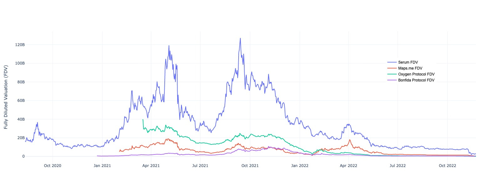 FDVs in Solana land reached absurd numbers during the bull market. To illustrate, these are the FDVs of Serum, Bonfida, Maps.me, and Oxygen: