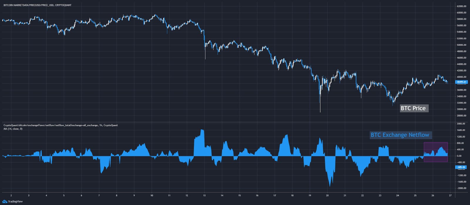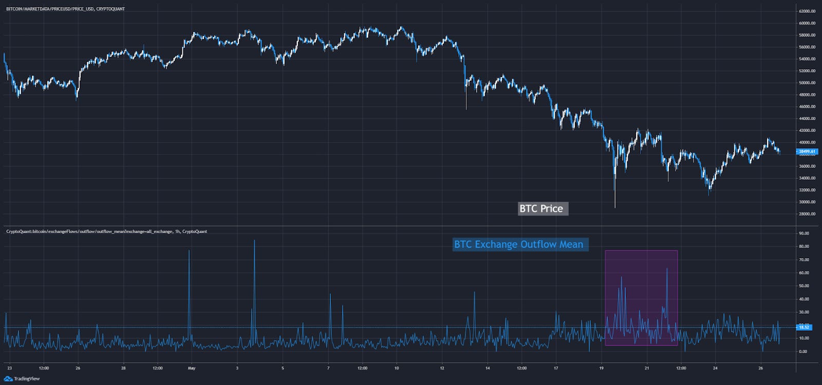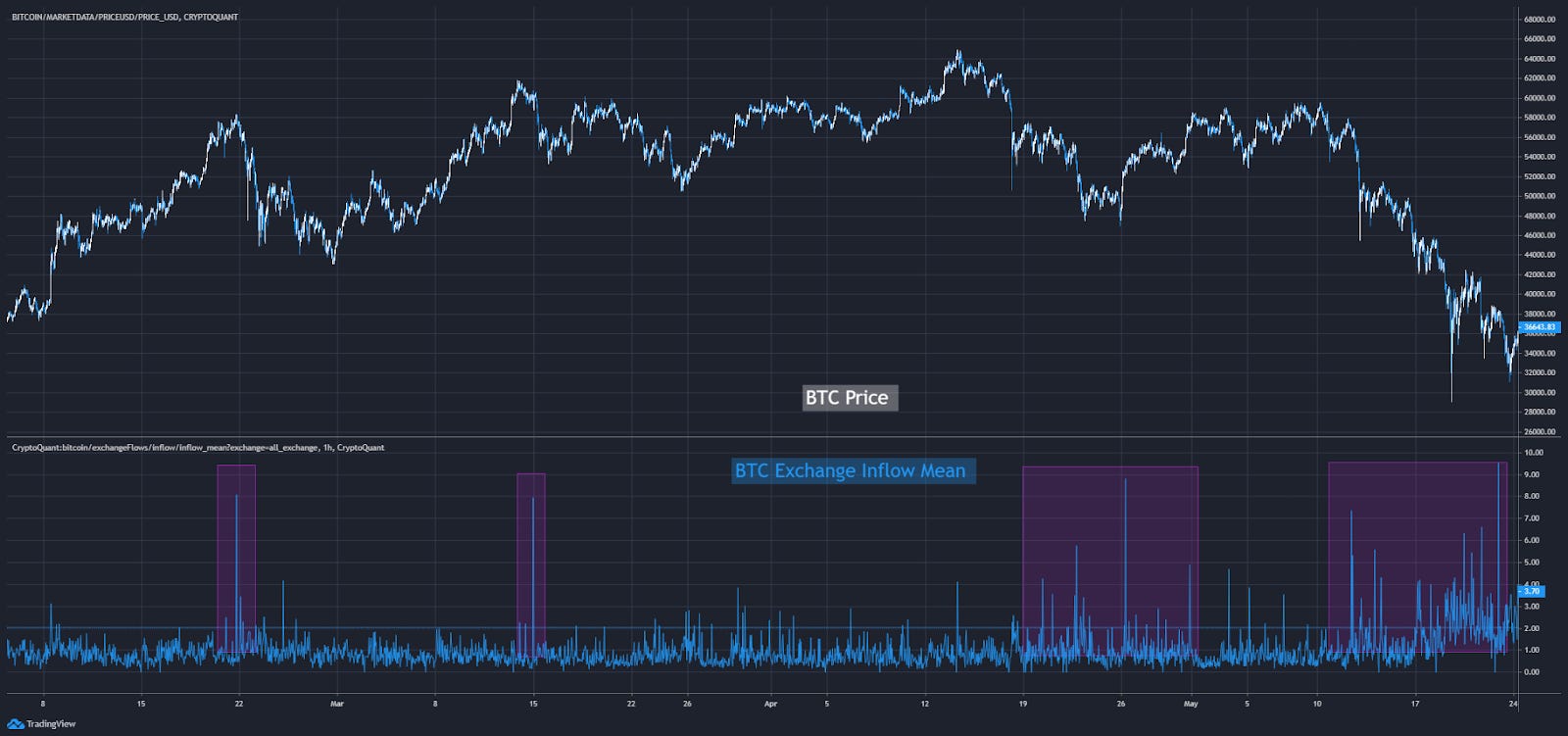 During the sell off we saw huge amounts of BTC enter exchanges. The bottom half of the chart below shows BTC exchange inflows mean. Its a way to view the amount of bitcoin entering exchanges. And we saw a lot of large spikes as price cascaded lower.