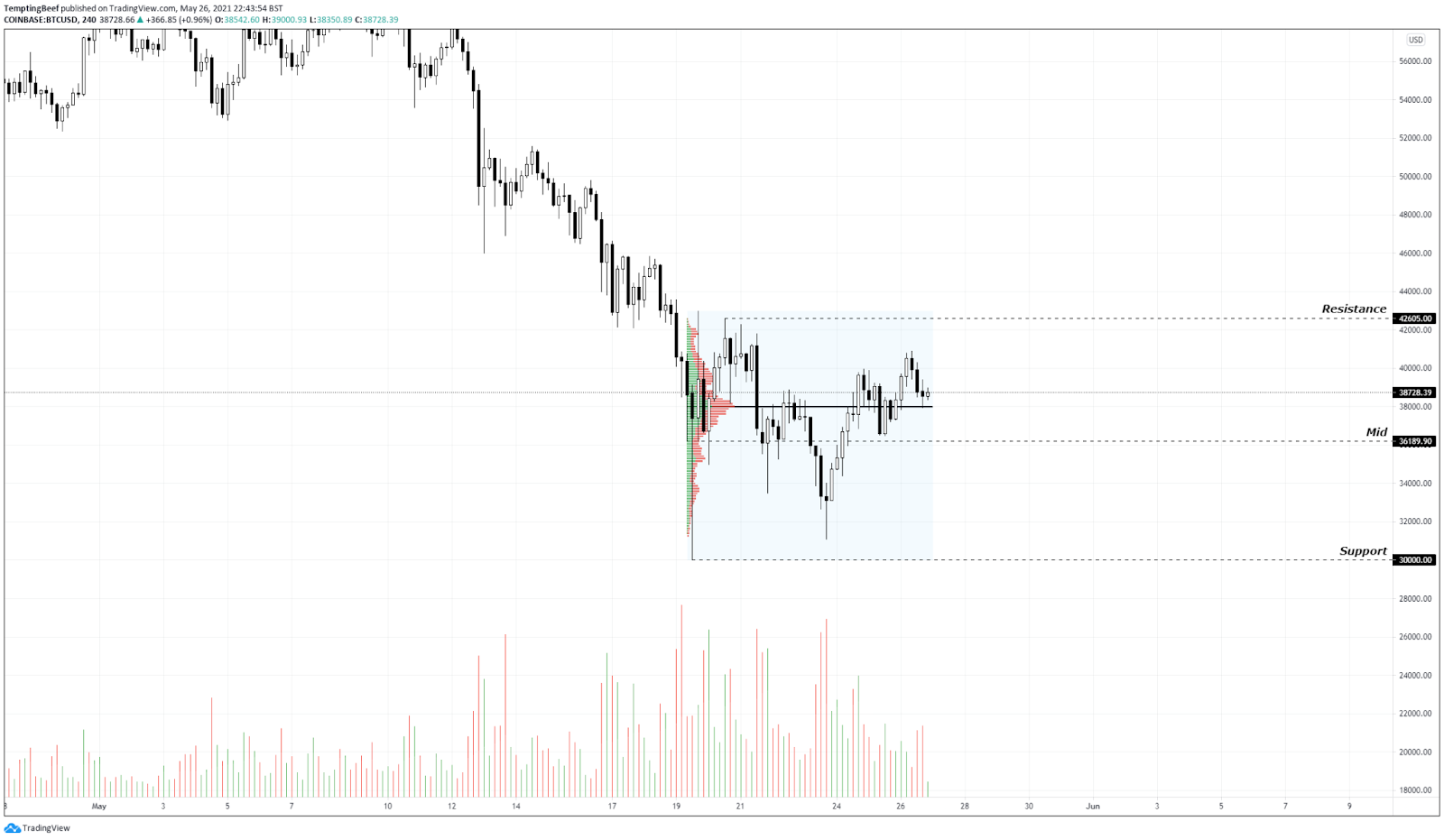 As you can see below, BTC is currently in this trading range from 30k to around 42k. It is comfortably hanging out in the upper part of the trading range for now.