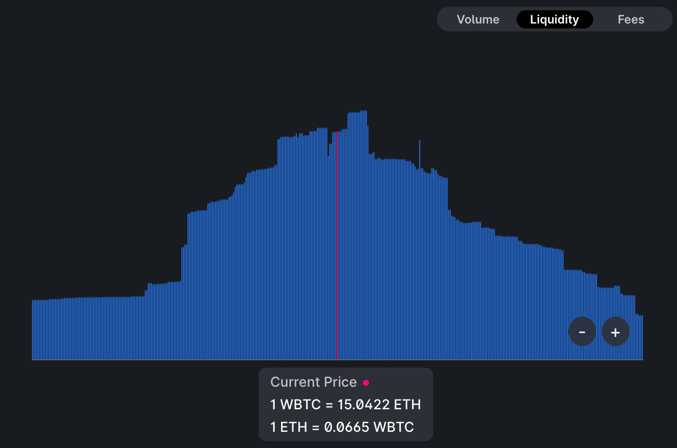 This change in design resulted in liquidity to be a bit more “bumpy.” You can see this in a very popular wBTC/ETH pool in v3 below. In v2, this liquidity profile looks more like a symmetrical distribution curve.
