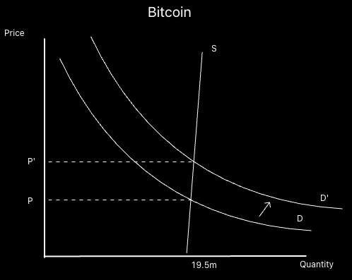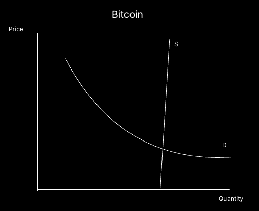Bitcoin’s demand curve – for today’s purposes – is a normal curve, but its supply curve is nearly vertical. Reason being is the supply is coded in.