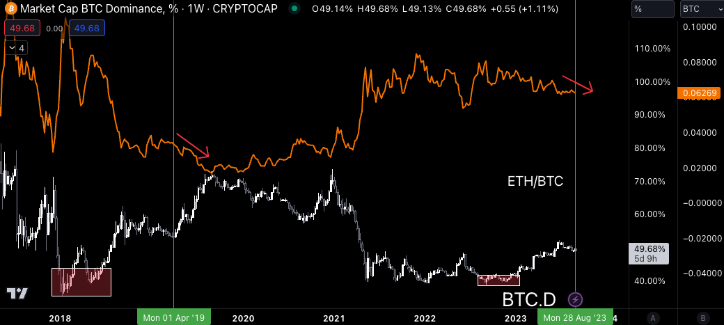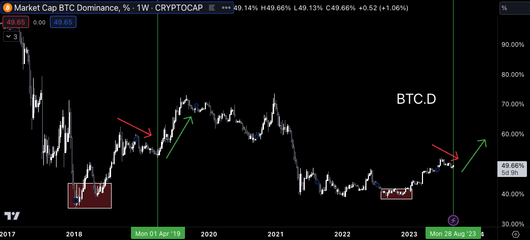 It has to do with Bitcoin dominance (BTC.D), a measure of Bitcoin’s market share of crypto based on its market cap. In the chart below, we can see that that rally in 2019 started back in 2018, when we got a nice double bottom (red box), followed by a solid run up until Q1 2019.