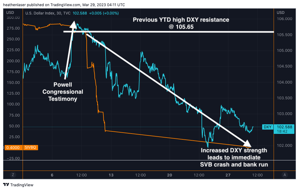 Renewed dollar strength sparked an immediate flight to cash and triggered nationwide bank runs, which led to Silicon Valley Bank (SVB, orange line, left axis) among others falling into an immediate FTX-esque death spiral.