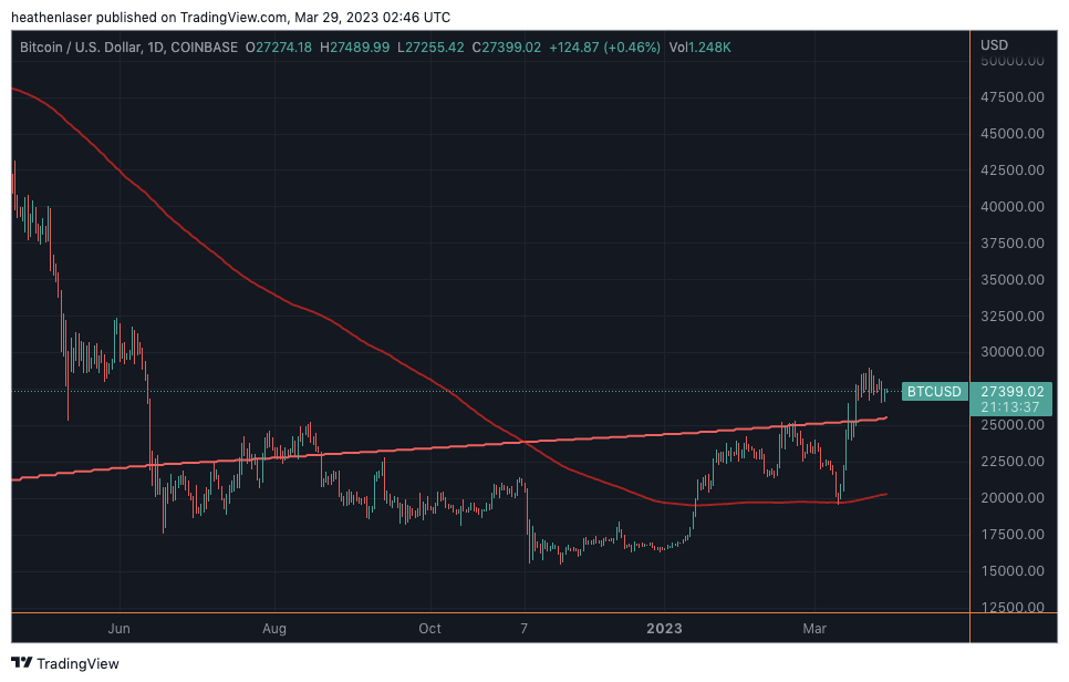Below, we see how despite the turbulence of early March, Bitcoin not only maintained its bull market structure when it held the 200-day DMA (red line), it further advanced it by making a clean break of February’s resistance level (200-day WMA, pink line) the following week.