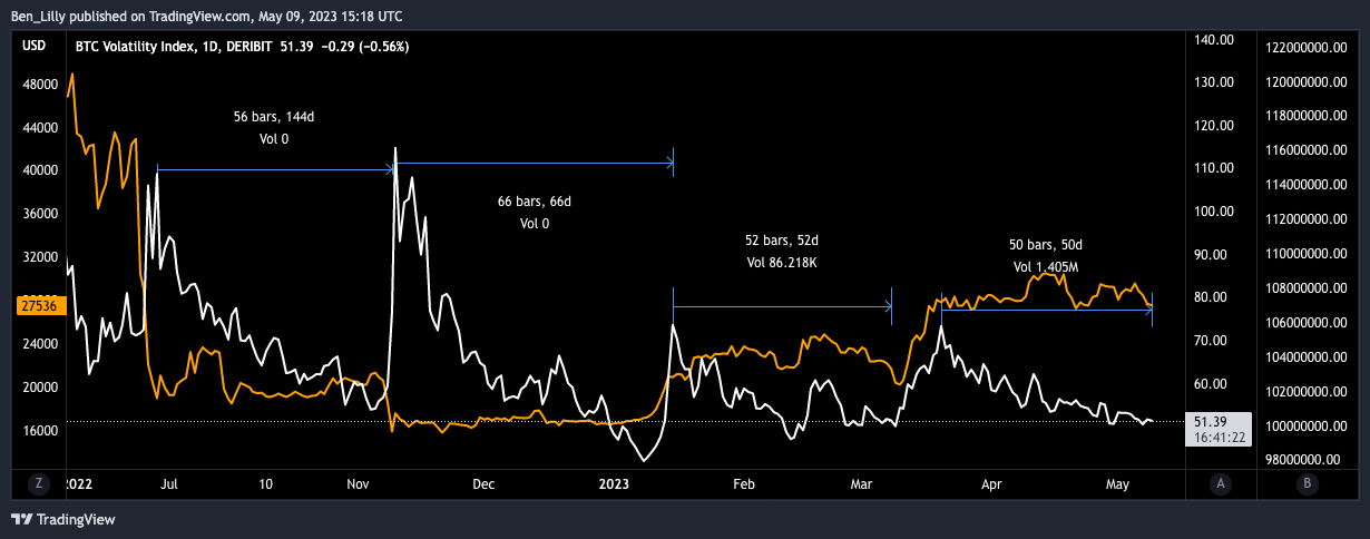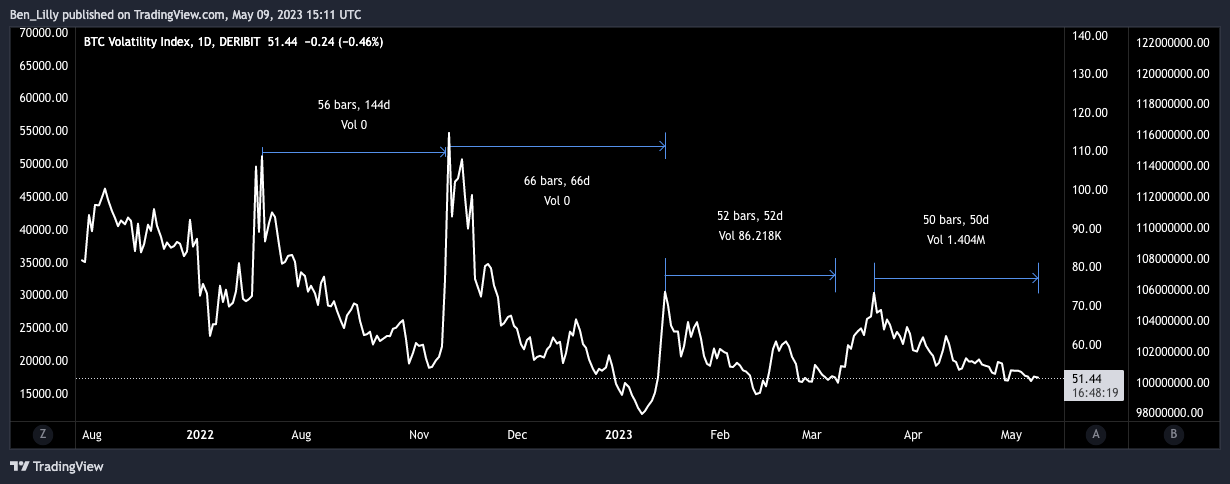 To show you what I’m referring to, here is a chart of Deribit’s volatility index (DVOL on TradingView). Over the last 50 days, markets have become less volatile — represented as the line going down.