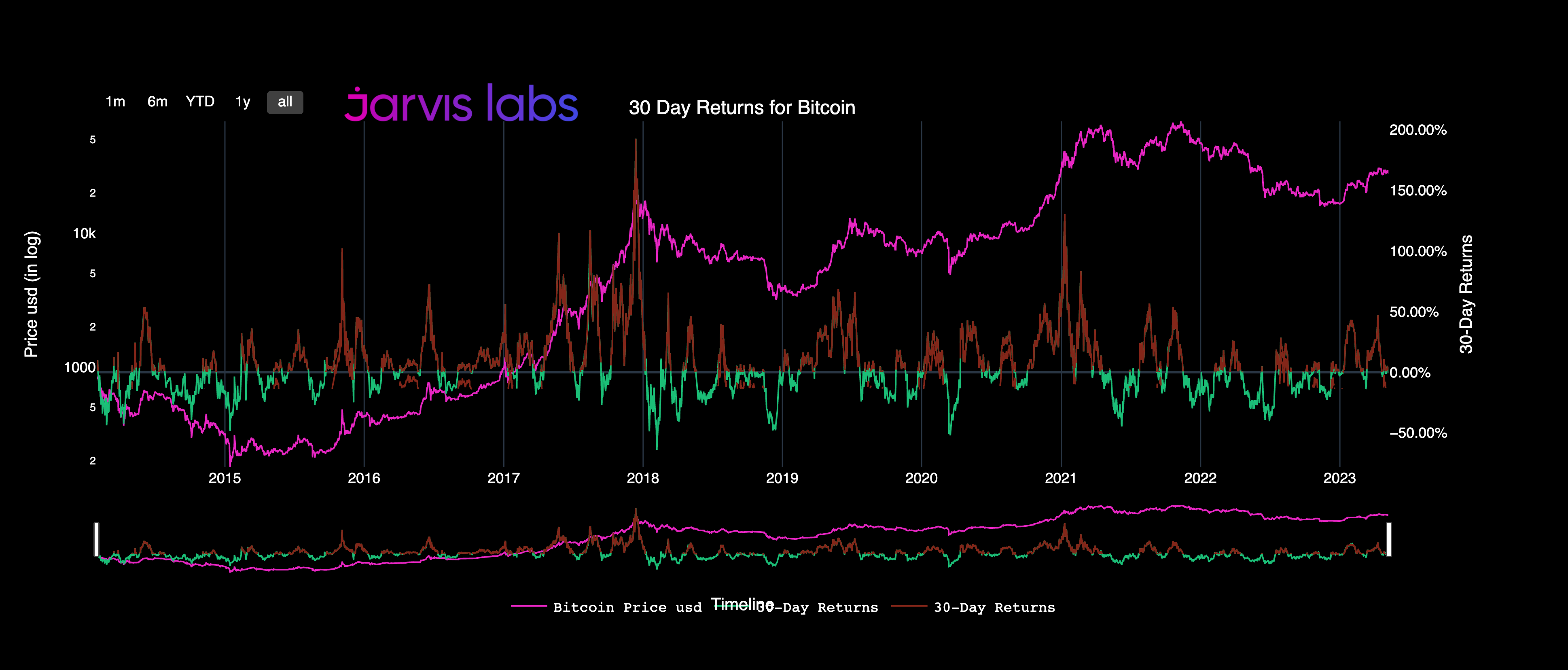 This period of calmness is also understandable given the 30-day returns for Bitcoin. That’s what the chart below shows, with BTC price in pink and 30-day returns represented by the multicolored line below.