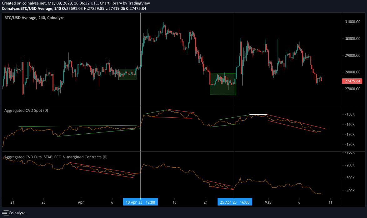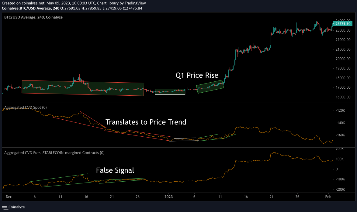 In the chart below, we can see how spot CVD (middle subplot) is translating to price trends more so than futures CVD (bottom subplot).