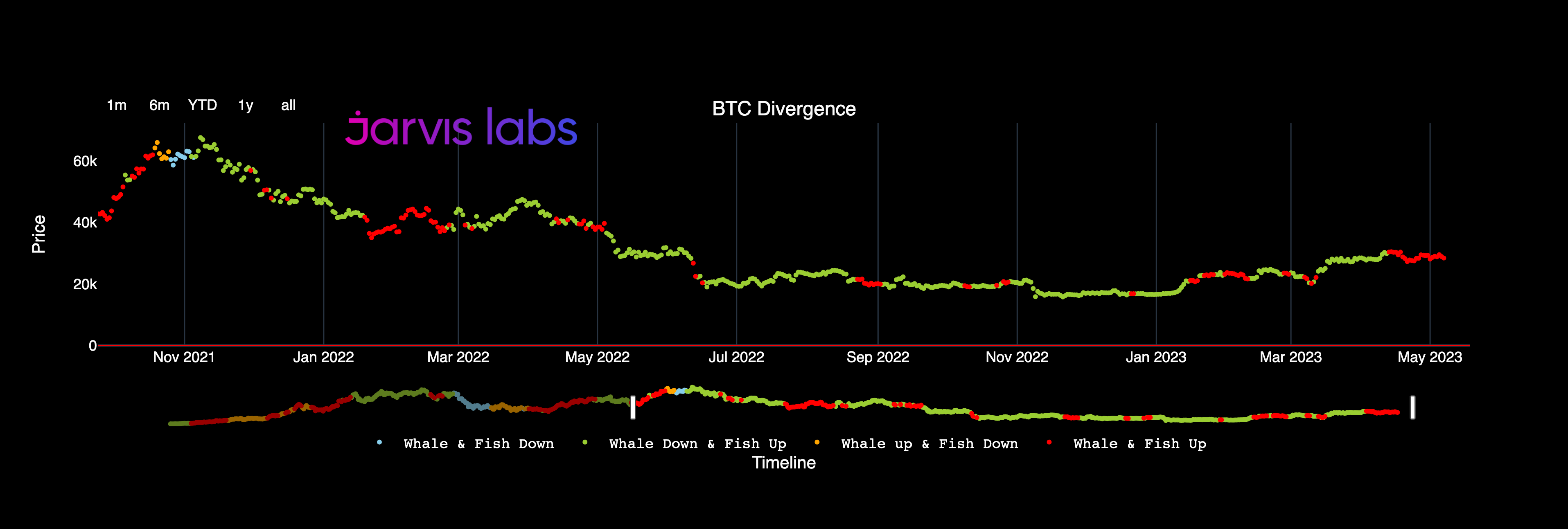 The chart below shows both whale and fish buying. When looking for whale interest, we want to see red or orange dots, and right now, we have lots of red dots forming.