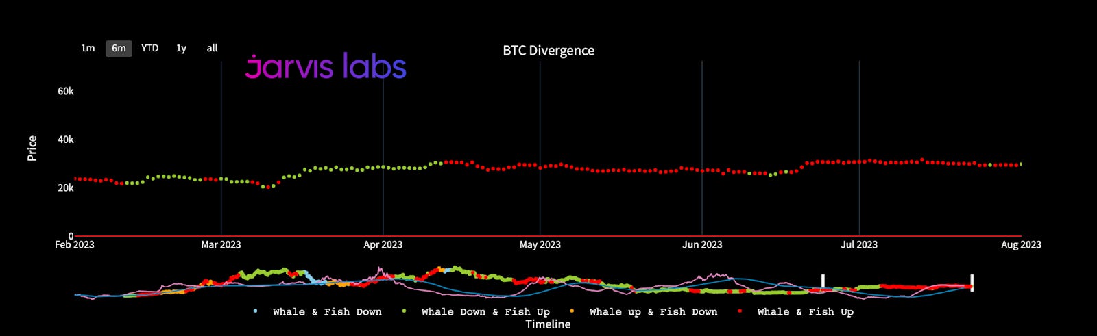 According to him, whales (wallets with over 10,000 BTC) have been accumulating Bitcoin since April, even buying above $30,000. You can see that in the chart below. For our purposes, focus on the red dots, which indicate whales buying.