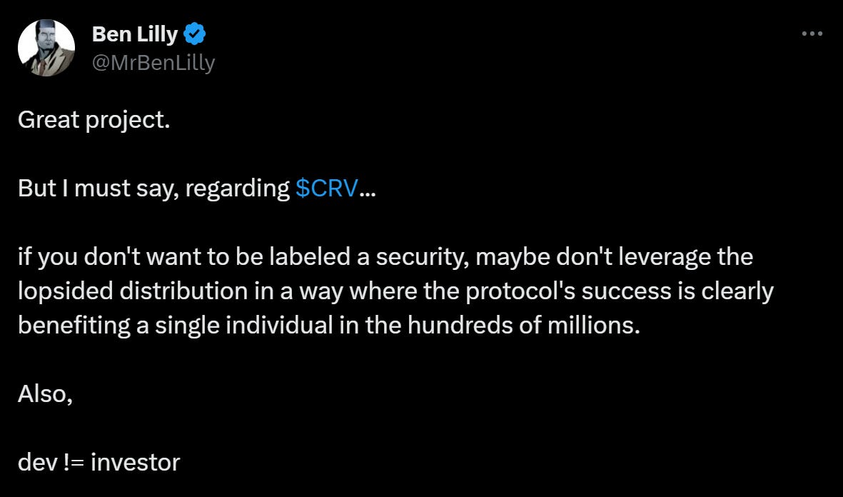 I don't think they were asleep at the wheel. Maybe they just trusted the Curve guys to not be malicious... I don't know if it's like, “Oh, yeah, we know this guy, like we might let him do this loan even though we probably shouldn't.” Gauntlet and Chaos Labs, which are two risk shops, recommended not to allow this and basically to put caps on the amount of CRV that Michael Egorov could borrow. And these DeFi protocols just didn't listen. So, now we're faced with this.
