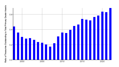 As the bars go higher in the chart below, the amount of Treasuries relative to the assets held by the dealer is rising.