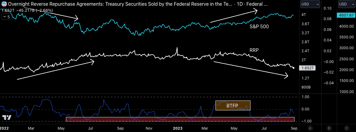 The main period of time where this correlation was not near -1 was after the BTFP began. That’s because BTFP was a different type of liquidity, so RRP didn’t need to be used. Needless to say, all this liquidity has been boosting asset prices since rates began to rise.