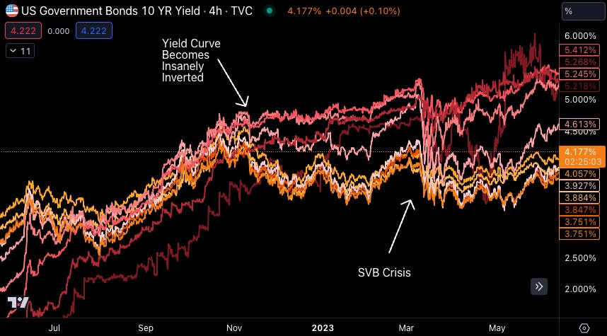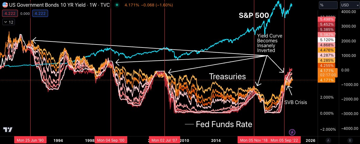 Here’s a chart that highlights the issue… Near the end of 2022, after Powell spent multiple quarters inflicting pain through raising rates, the curve gave the signal it always does by becoming insanely inverted. Shortly after, SVB failed and yields started to become volatile.