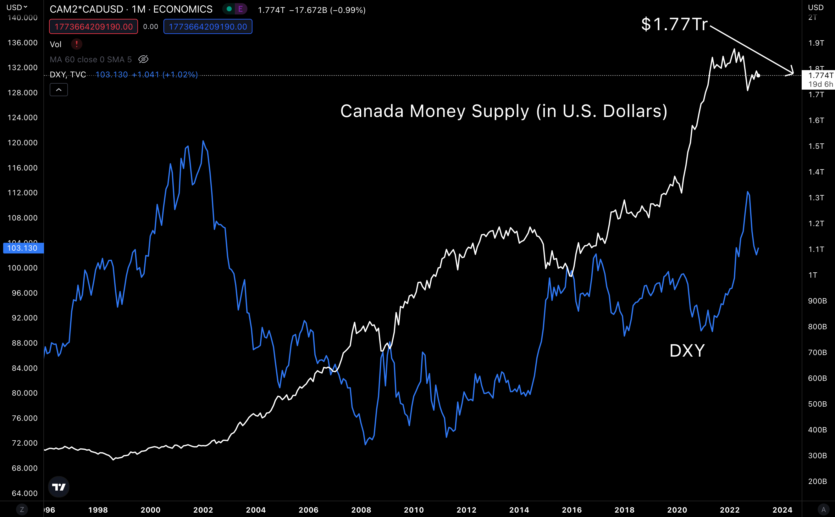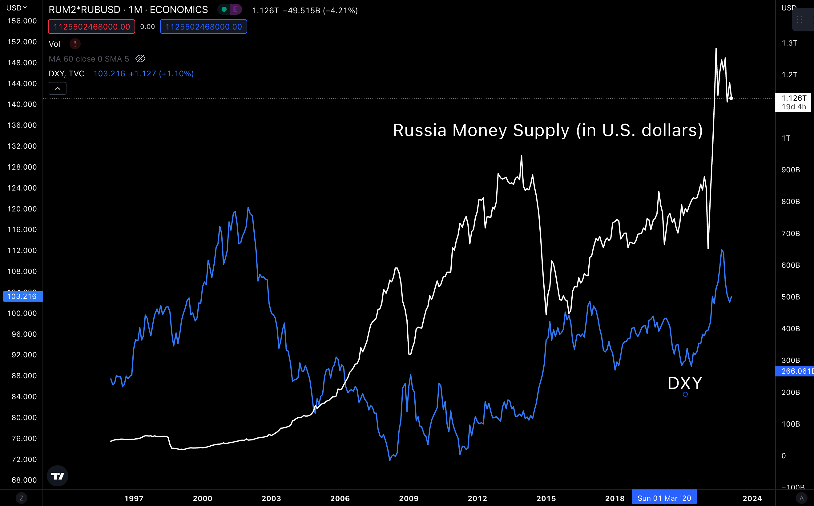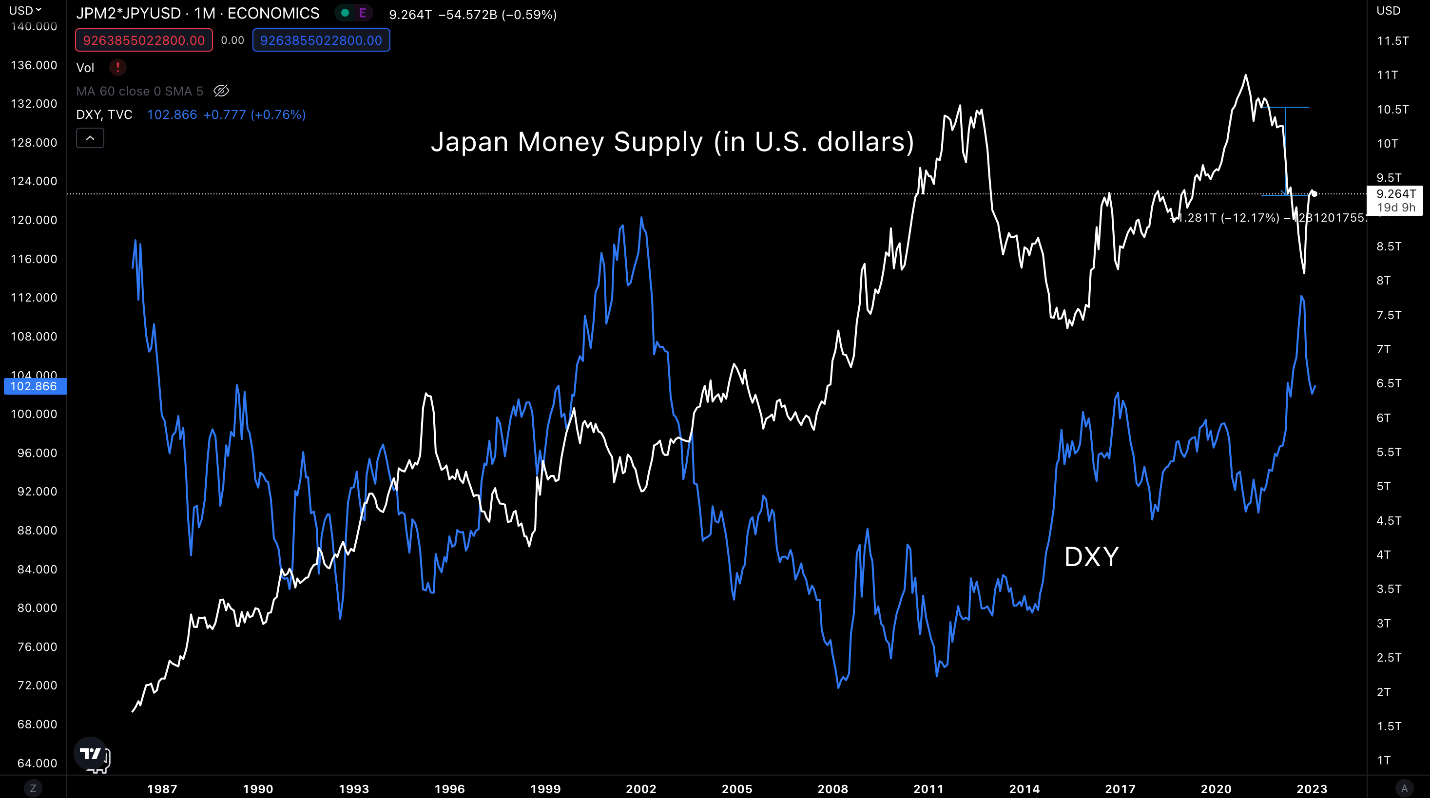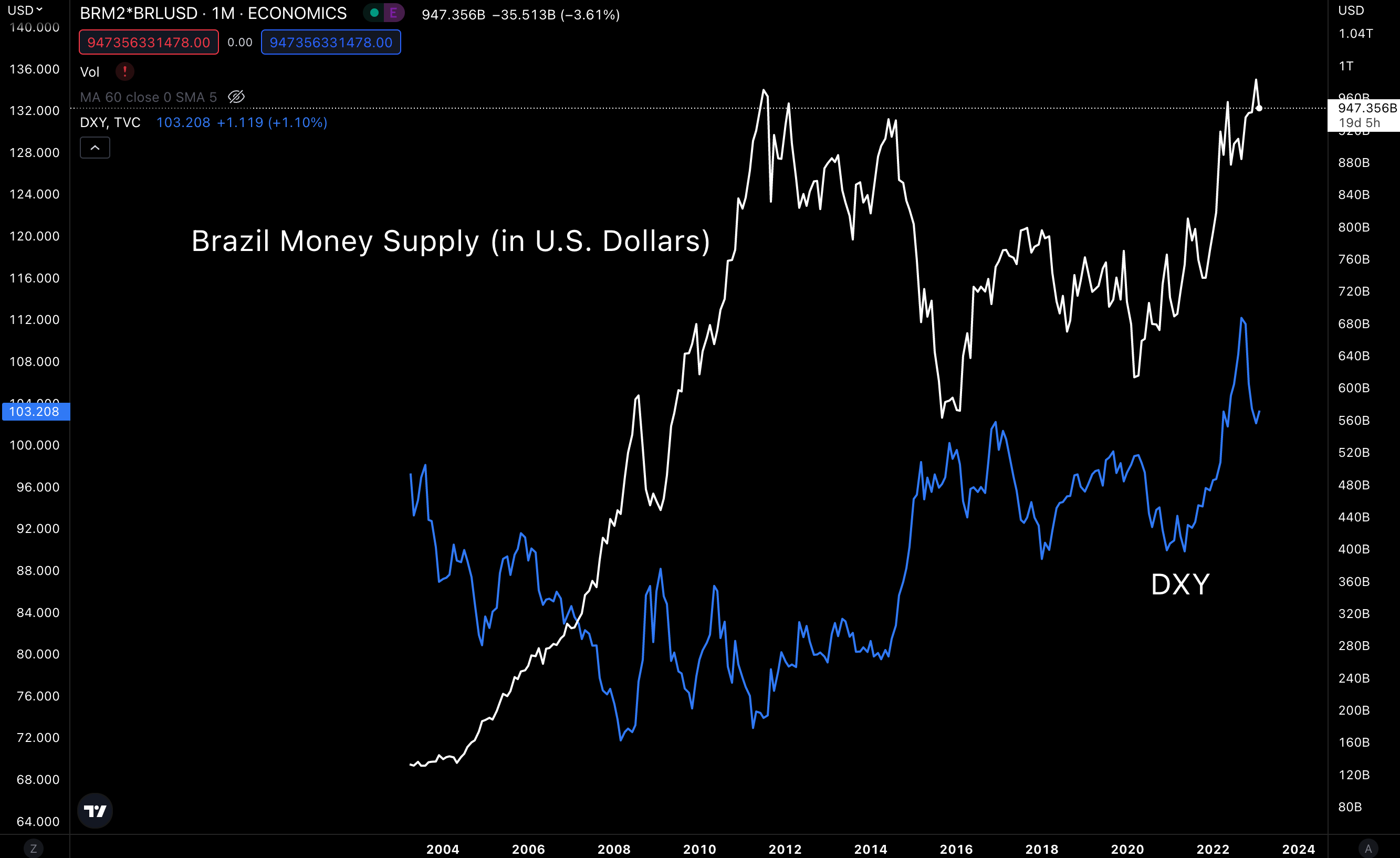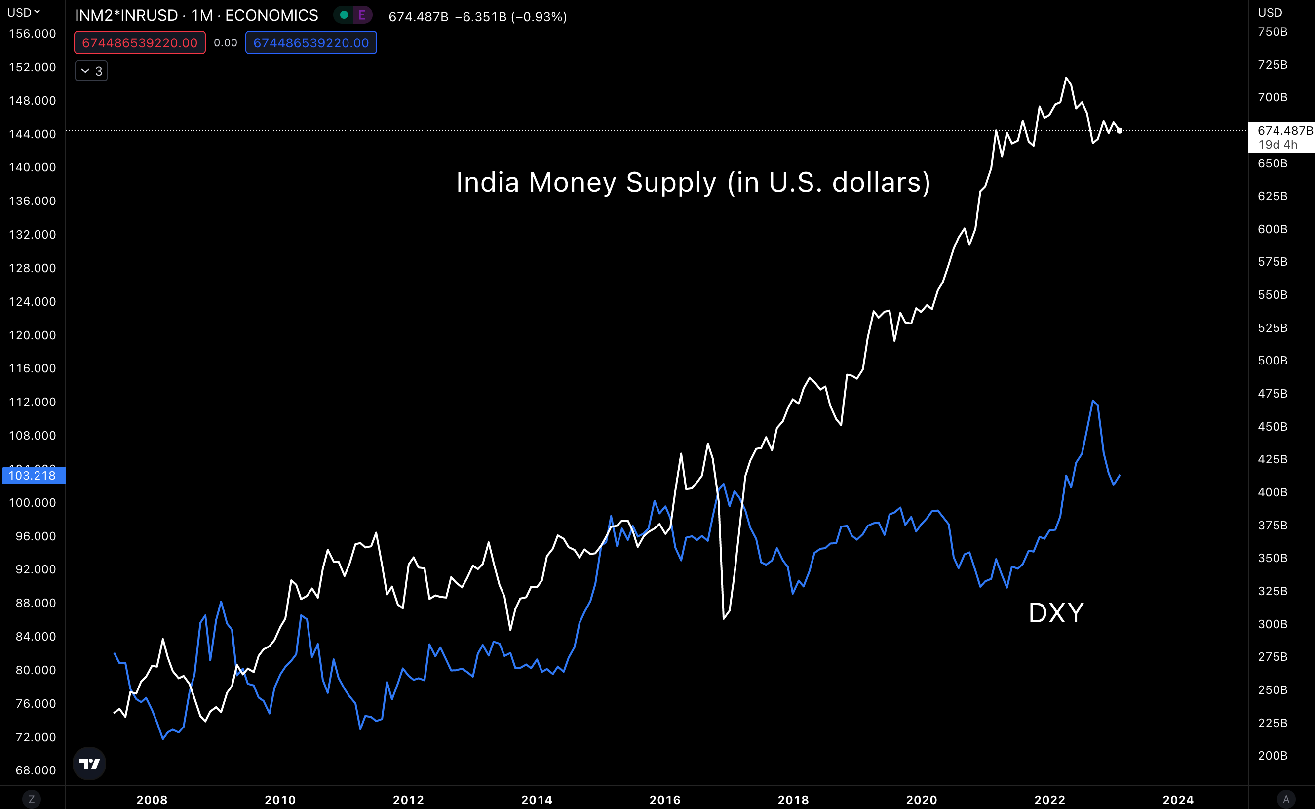 Then when we convert this supply into USD, here’s what we get. Similar findings to China where the move in DXY is creating major swings in money supply. From June to December, this created what looks to be a 12% drop in money supply.