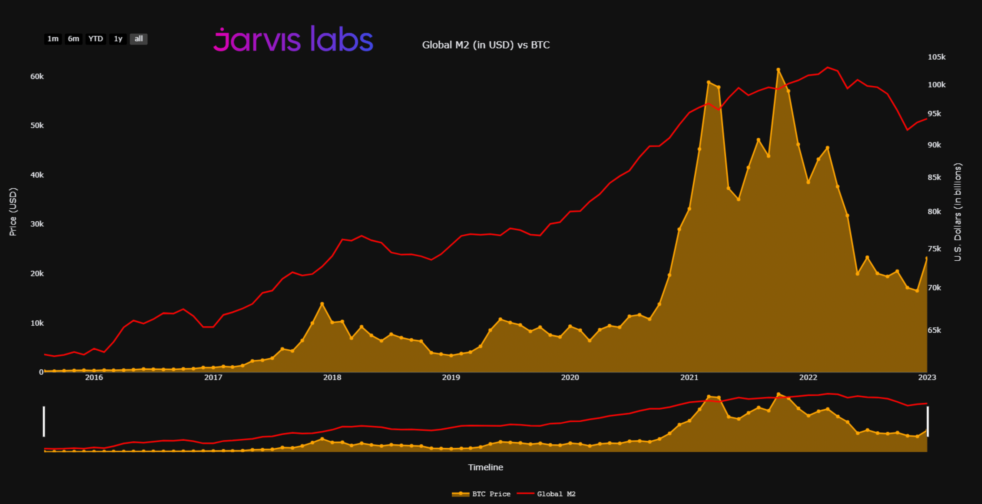Below is that chart compared to the price of Bitcoin in yellow. Note how swings up and down in terms of M2 (in USD) are associated with the price of Bitcoin.