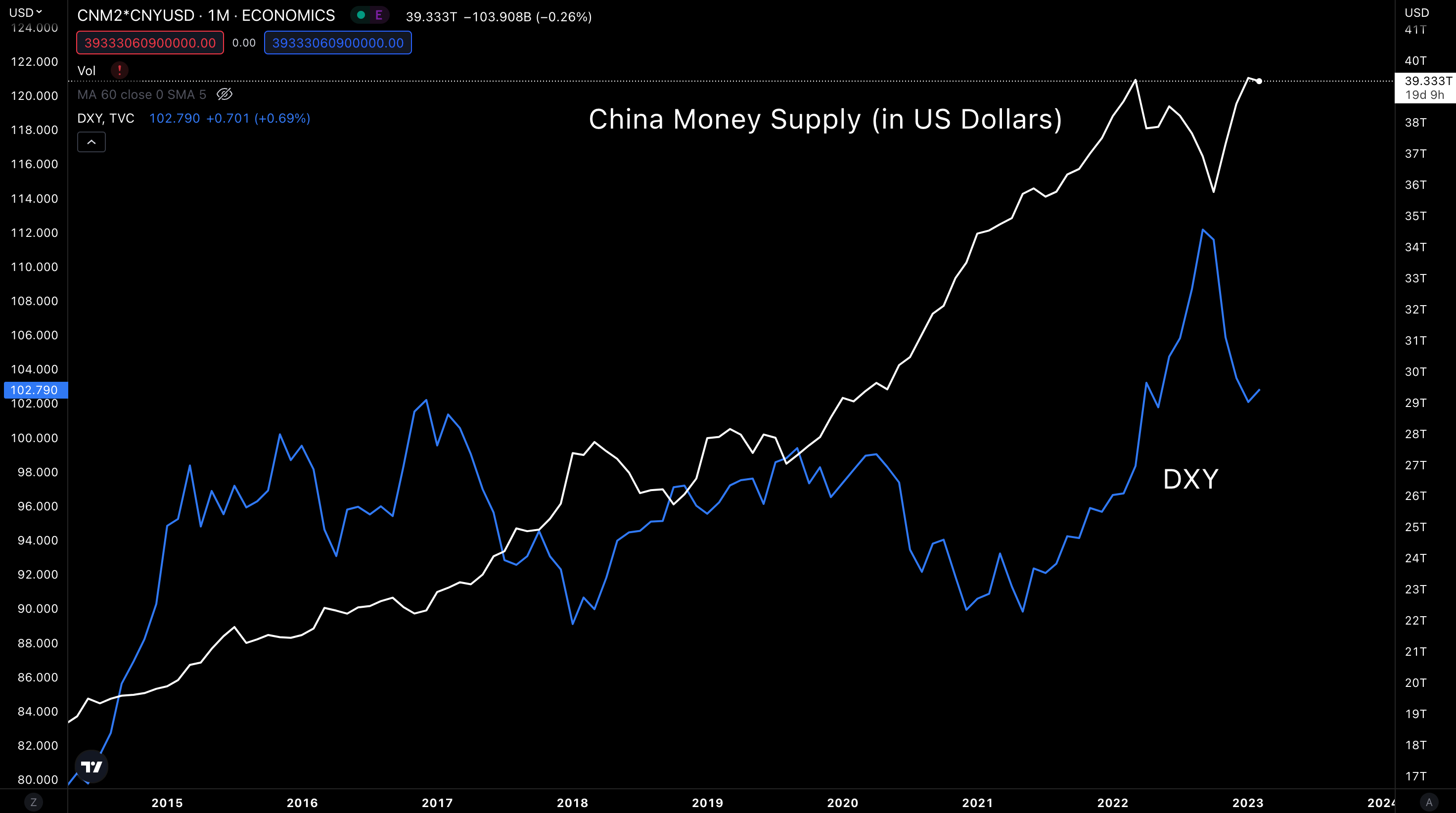 Here, we see clearly the change in the U.S. dollar’s strength (as measured by the U.S. Dollar Index, or DXY) over the last year makes it appear like China’s money supply was on the decline for 2022.