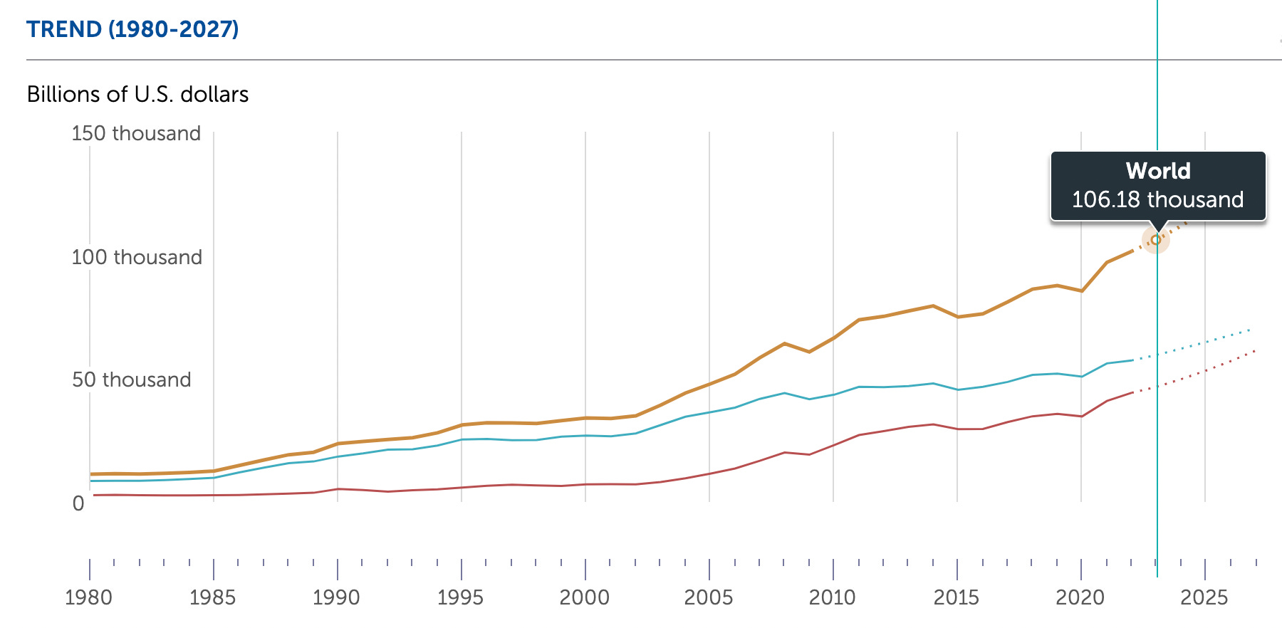 This gives the group a 2023 GDP outlook for $70.56 trillion. These 10 countries produce twice the amount of the rest of the world’s 227 countries tallied in the economic outlook dataset.