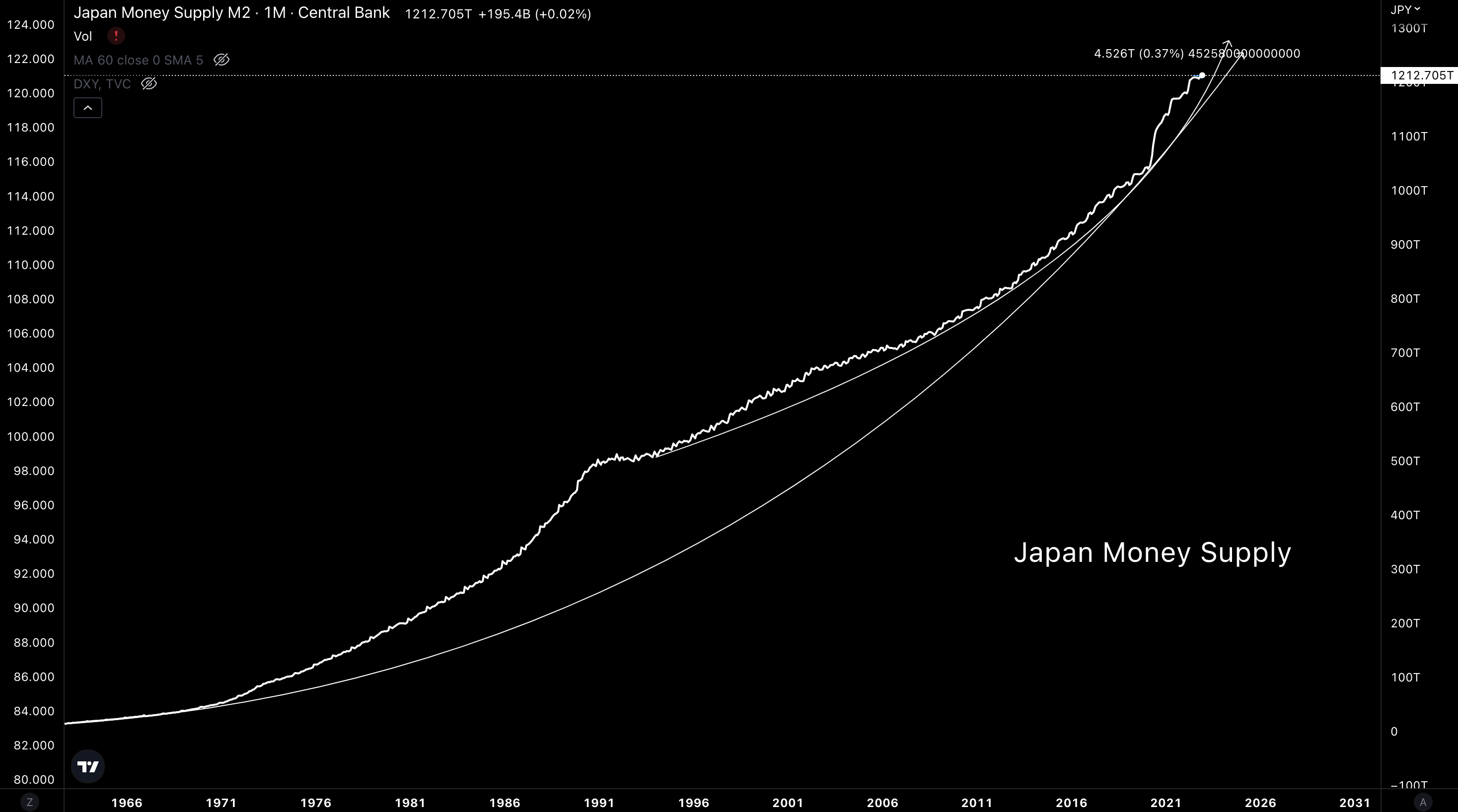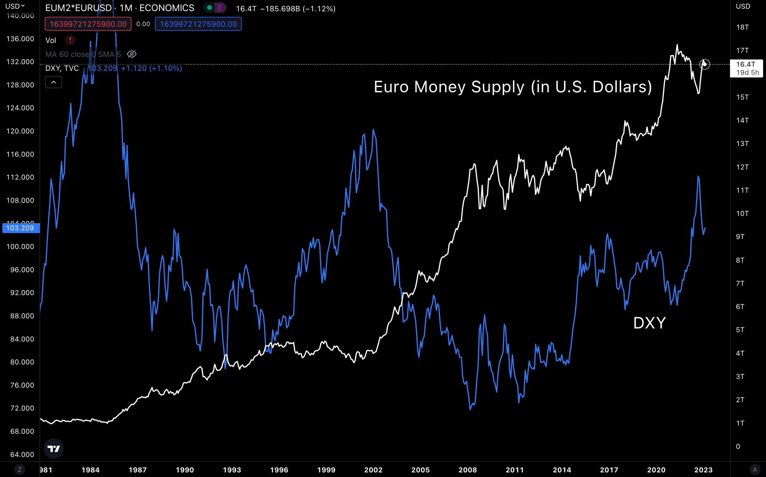 So if the dollar loses strength and the money supply starts to rise again, we have a strong double dose of liquidity happening here → more supply + more strength per unit of currency.