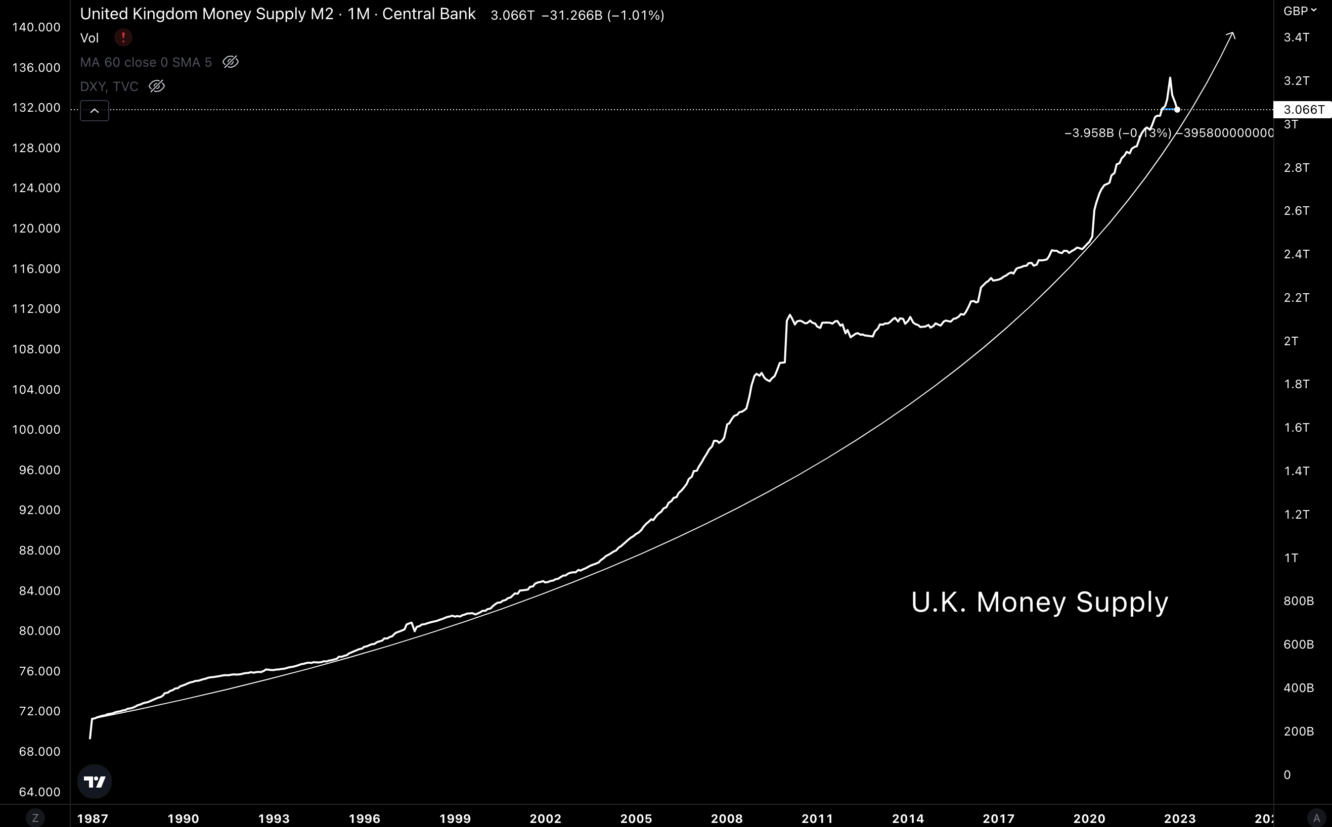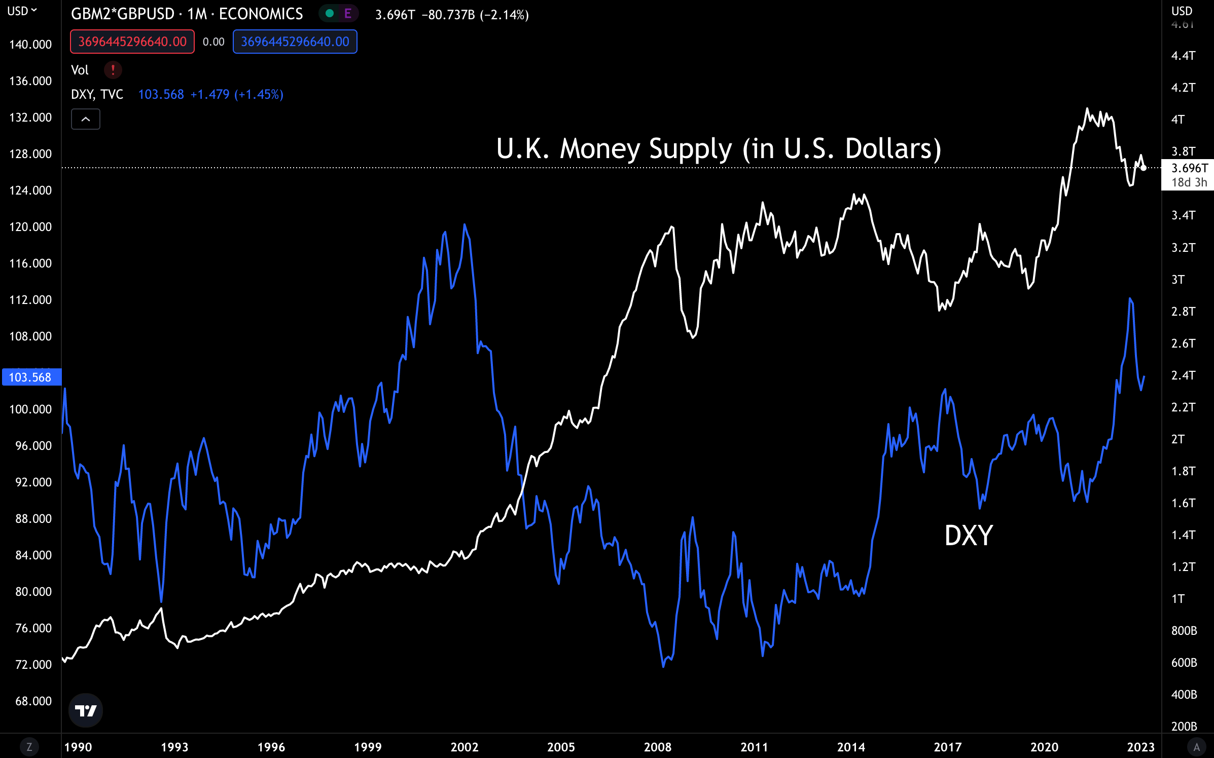 The money supply in USD terms is not surprising as the British pound to USD has gotten hit, and this is highly variable with DXY like many other currencies. What is important here is the amount of supply in USD comes to $3.7 trillion, which is about $0.3 trillion less than six months ago.
