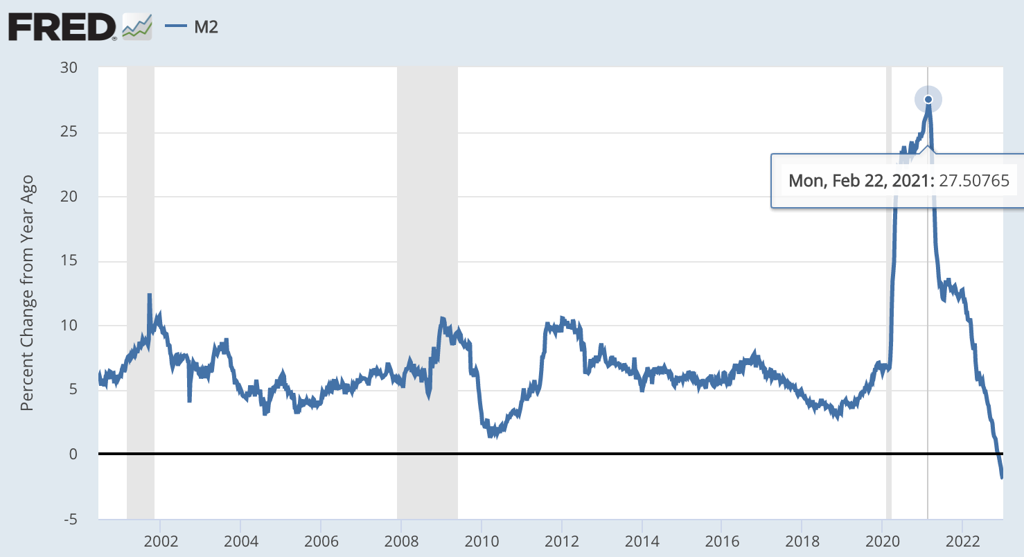 At one point, the annual change of money supply as measured by M2 was up 27.5%. You can see the monumental heap of liquidity doled out in 2020-2021 below.
