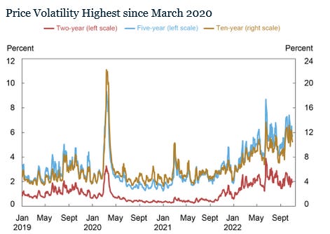 Per the chart, volatility for the 2-year, 5-year, and 10-year Treasurys has been the highest since 2020, which coincided with the shallowest order book depth since 2020.