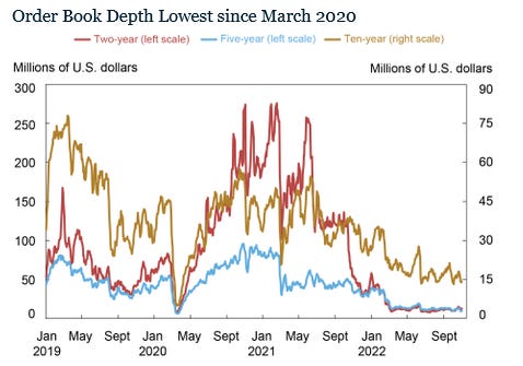 Below is a chart with order book data through the third quarter of 2022 for the 2-year (red line), 5-year (blue line), and 10-year Treasurys (yellow line). The market depth has been decreasing and getting shallower by the month since the Fed started to hike rates back in March 2022.