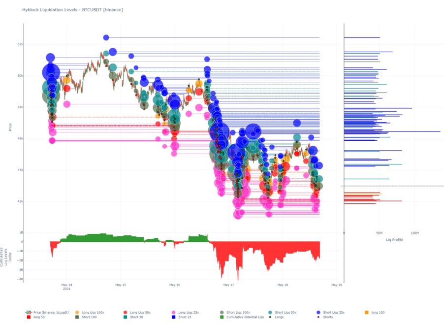 What’s more, the amount of liquidity built up around $42k is growing. Here is a liquidity map. It helps visualize the amount of capital that can get wiped out at various levels. The bigger the bubble, the more capital. The greater the amount of bubbles, the more capital.