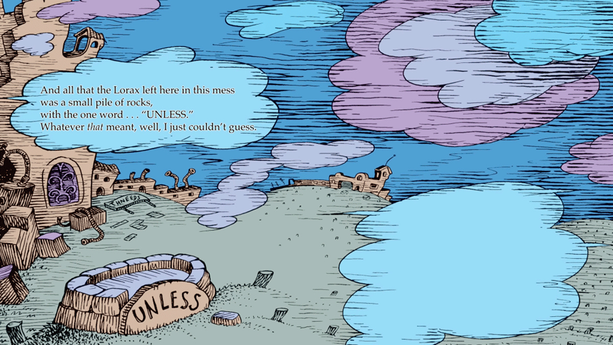 It’s from a book called The Lorax by Dr. Seuss, a famous children’s book author in the U.S. In that picture, a single word was prominent: “Unless.”