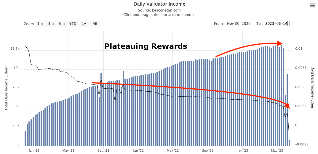 Meanwhile, the rewards validators earn are beginning to plateau. You can see this in the chart below.
