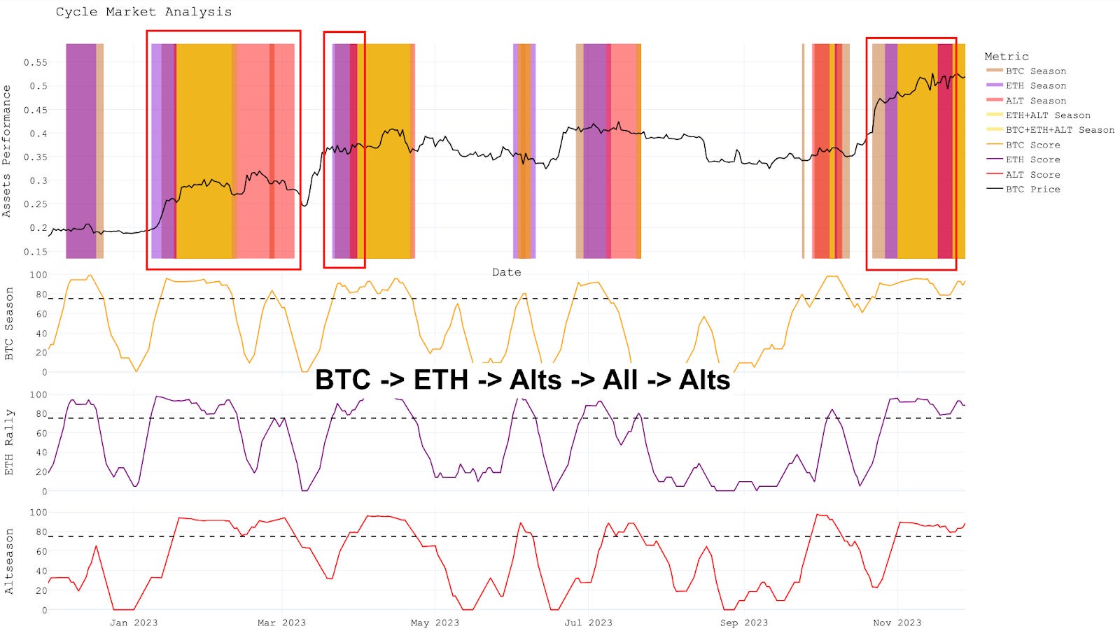 The takeaway is that the yellow phase, which is when all tokens are “in season,” was dominant since November 1. This is a very bullish market to get involved in whenever we realize it.