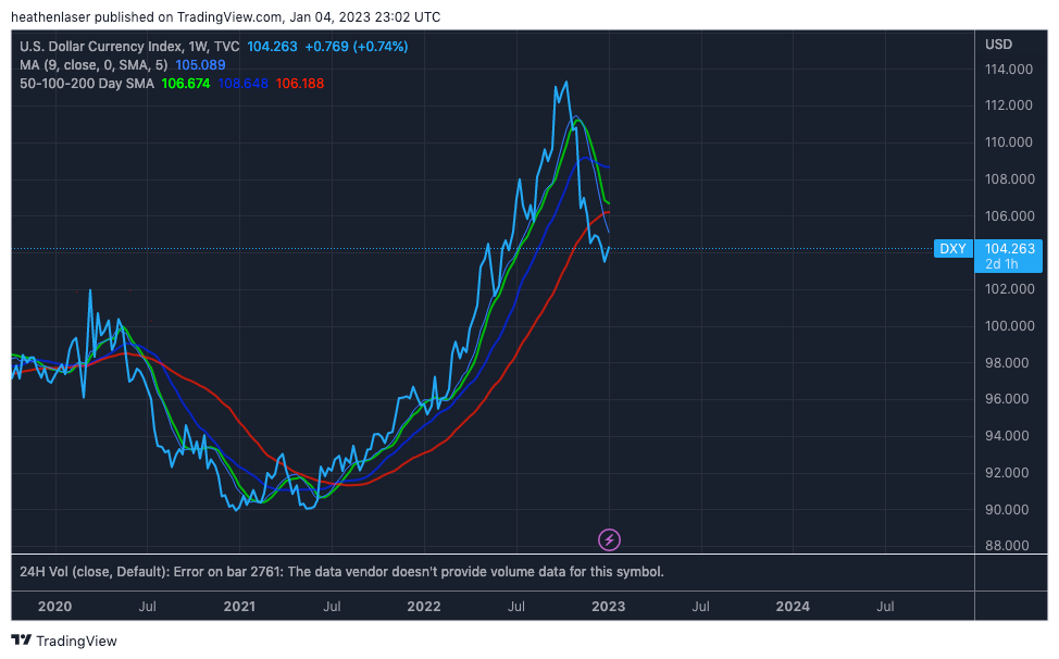The last time the dollar was below all major MAs was in Spring 2021, when crypto markets were in their full glory.
