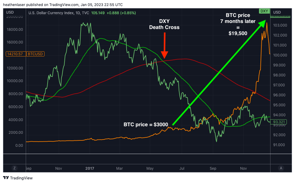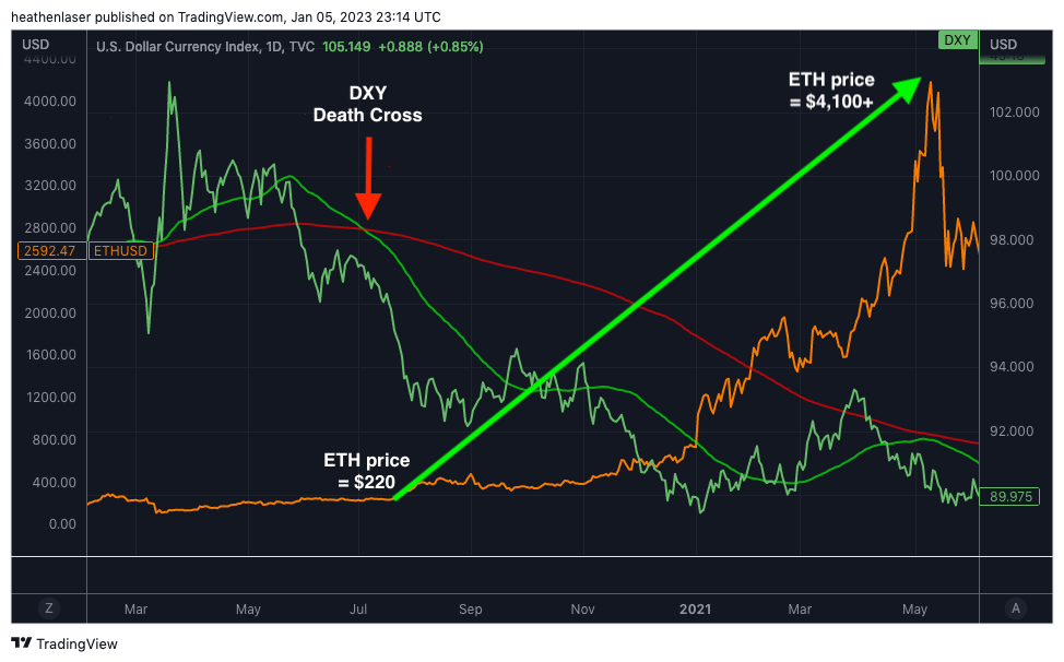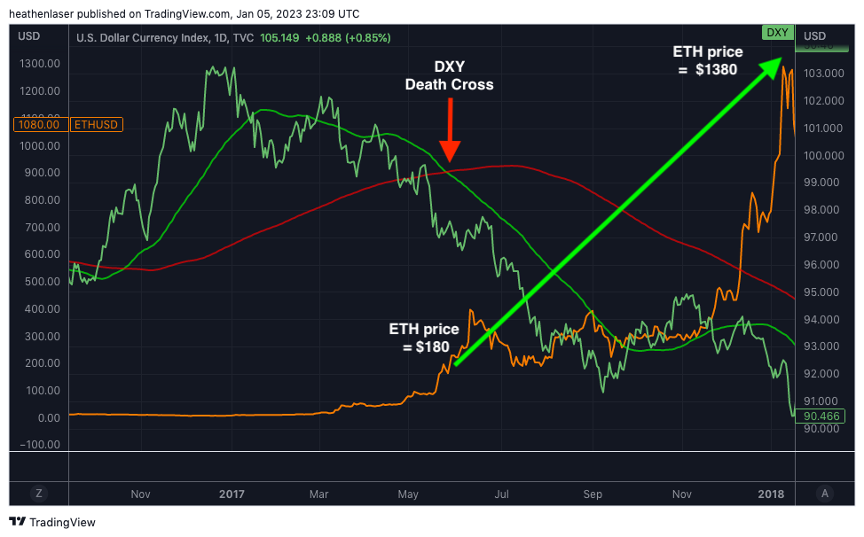 The first came in mid-2017. The dollar death-crossed (green line) while BTC was trading at roughly $3,000 and ETH near $185.