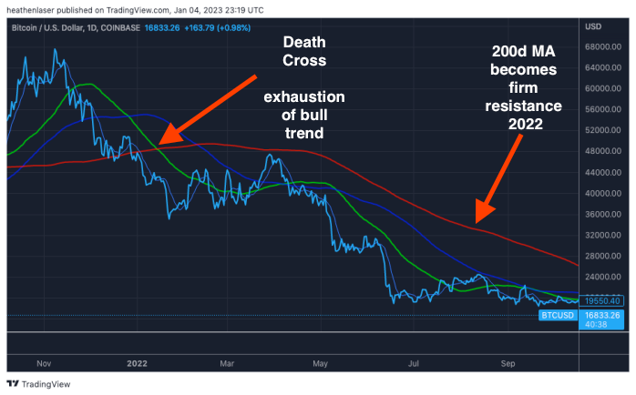 For reference, Bitcoin (BTC, light blue line) experienced a “death cross” in early January 2022 when prices were near $45,000.