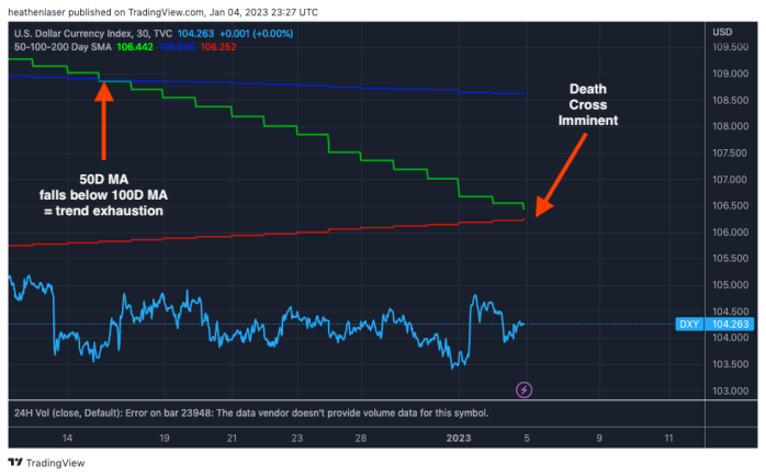 DXY’s 50-day MA has already fallen below its 100-day MA, which signals exhaustion. And as we see below, “King Dollar” is now days away from its first death cross since 2020.