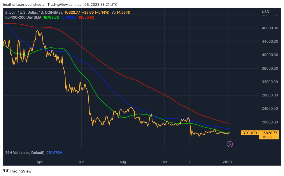 This chart below shows BTC versus its 50-, 100-, and 200-day MAs.